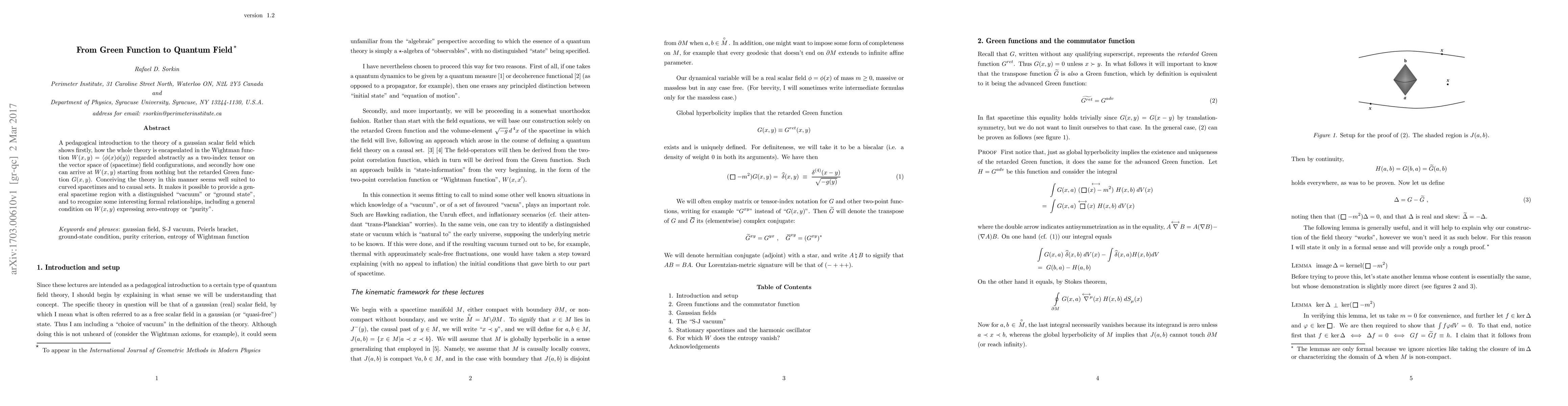 A pedagogical introduction to the theory of a gaussian scalar field which shows firstly, how the whole theory is encapsulated in the Wightman function $W(x,y)=\langle\phi(x)\phi(y)\rangle$ regarded abstractly as a two-index tensor on the vector space of (spacetime) field configurations, and secondly how one can arrive at $W(x,y)$ starting from nothing but the retarded Green function $G(x,y)$. Conceiving the theory in this manner seems well suited to curved spacetimes and to causal sets. It makes it possible to provide a general spacetime region with a distinguished "vacuum" or "ground state", and to recognize some interesting formal relationships, including a general condition on $W(x,y)$ expressing zero-entropy or "purity".