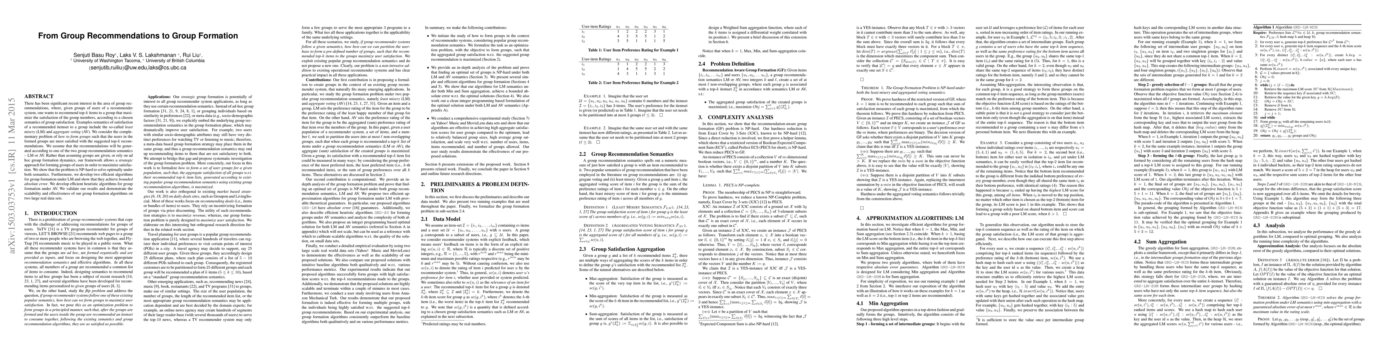 This paper investigates the problem of forming groups of users to maximize satisfaction from top-k recommendations, using either least misery or aggregate voting semantics. It proposes efficient algorithms for group formation and demonstrates their effectiveness and scalability through real-world data analysis.