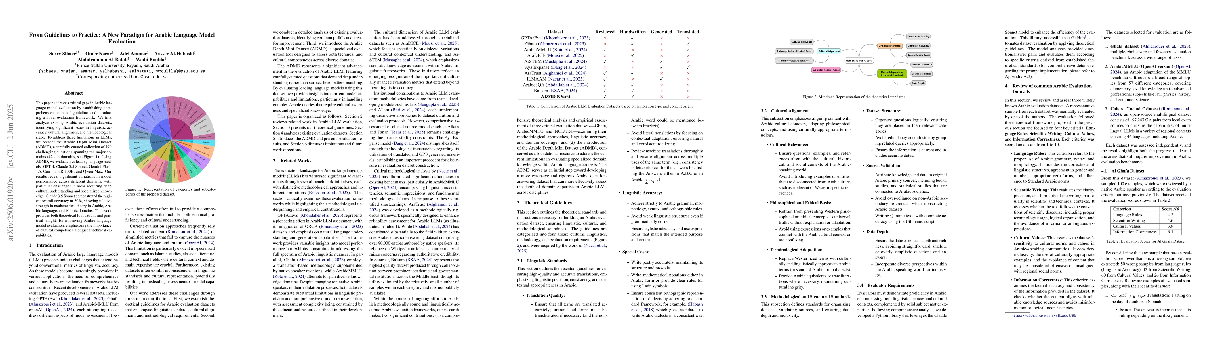 This paper addresses critical gaps in Arabic language model evaluation by establishing comprehensive theoretical guidelines and introducing a novel evaluation framework. We first analyze existing Arabic evaluation datasets, identifying significant issues in linguistic accuracy, cultural alignment, and methodological rigor. To address these limitations in LLMs, we present the Arabic Depth Mini Dataset (ADMD), a carefully curated collection of 490 challenging questions spanning ten major domains (42 sub-domains, see Figure 1. Using ADMD, we evaluate five leading language models: GPT-4, Claude 3.5 Sonnet, Gemini Flash 1.5, CommandR 100B, and Qwen-Max. Our results reveal significant variations in model performance across different domains, with particular challenges in areas requiring deep cultural understanding and specialized knowledge. Claude 3.5 Sonnet demonstrated the highest overall accuracy at 30\%, showing relative strength in mathematical theory in Arabic, Arabic language, and islamic domains. This work provides both theoretical foundations and practical insights for improving Arabic language model evaluation, emphasizing the importance of cultural competence alongside technical capabilities.