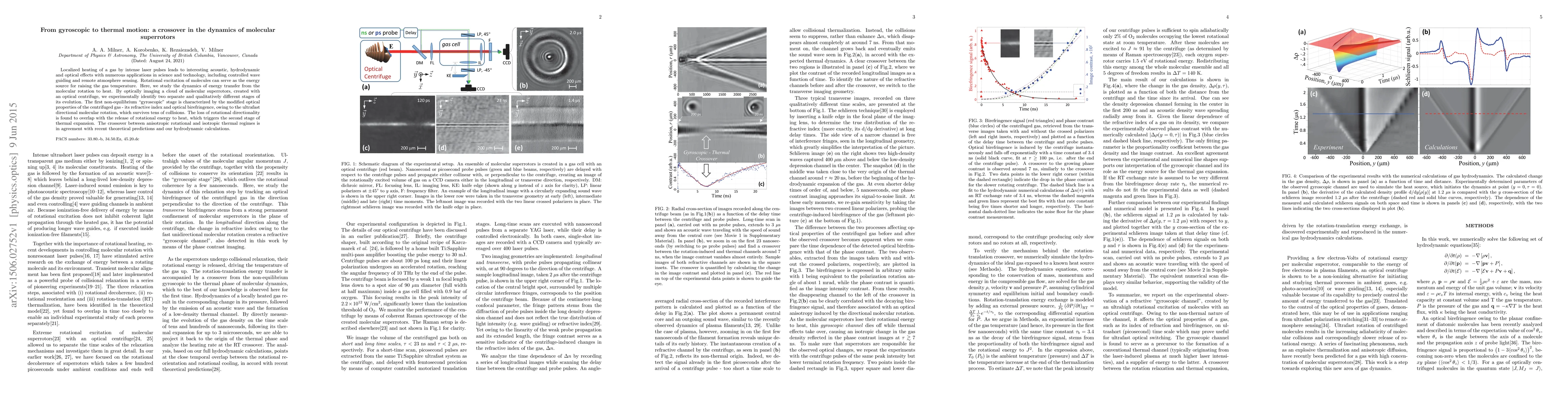 Localized heating of a gas by intense laser pulses leads to interesting acoustic, hydrodynamic and optical effects with numerous applications in science and technology, including controlled wave guiding and remote atmosphere sensing. Rotational excitation of molecules can serve as the energy source for raising the gas temperature. Here, we study the dynamics of energy transfer from the molecular rotation to heat. By optically imaging a cloud of molecular superrotors, created with an optical centrifuge, we experimentally identify two separate and qualitatively different stages of its evolution. The first non-equilibrium "gyroscopic" stage is characterized by the modified optical properties of the centrifuged gas - its refractive index and optical birefringence, owing to the ultrafast directional molecular rotation, which survives tens of collisions. The loss of rotational directionality is found to overlap with the release of rotational energy to heat, which triggers the second stage of thermal expansion. The crossover between anisotropic rotational and isotropic thermal regimes is in agreement with recent theoretical predictions and our hydrodynamic calculations.