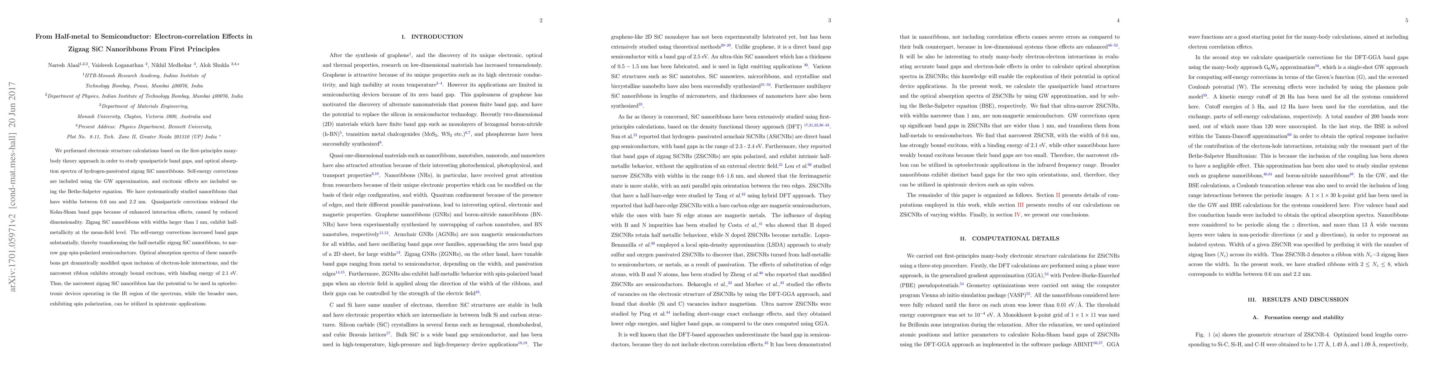 This study uses first-principles many-body theory to investigate zigzag SiC nanoribbons, revealing that quasiparticle corrections transform half-metallicity into narrow gap spin-polarized semiconductors. The narrowest ribbon shows potential for IR optoelectronic devices due to strong exciton binding.