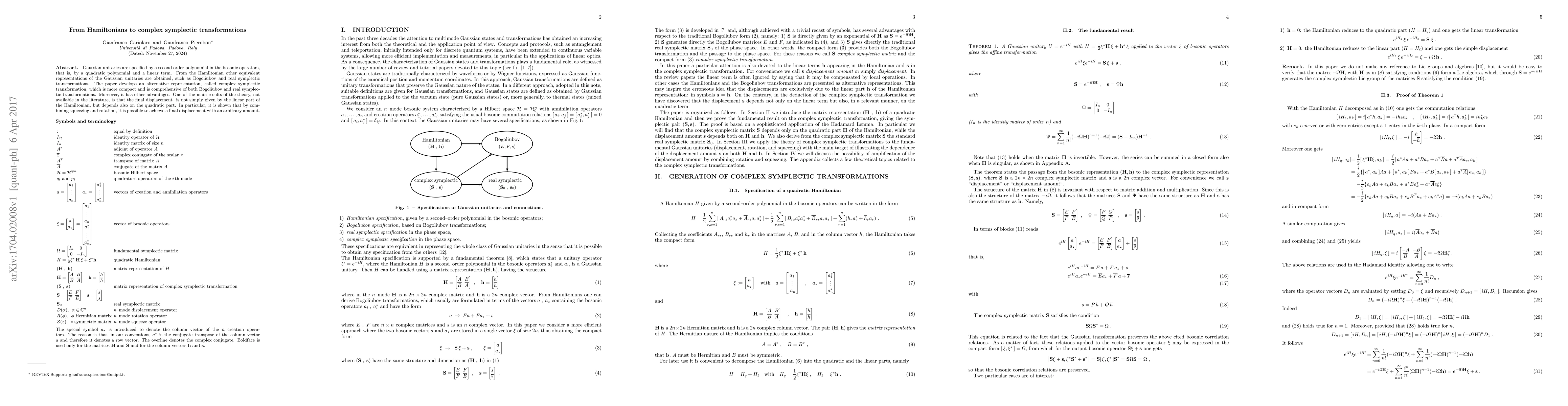 Gaussian unitaries are specified by a second order polynomial in the bosonic operators, that is, by a quadratic polynomial and a linear term. From the Hamiltonian other equivalent representations of the Gaussian unitaries are obtained, such as Bogoliubov and real symplectic transformations. The paper develops an alternative representation, called complex symplectic transformation, which is more compact and is comprehensive of both Bogoliubov and real symplectic transformations. Moreover, it has other advantages. One of the main results of the theory, not available in the literature, is that the final displacement is not simply given by the linear part of the Hamiltonian, but depends also on the quadratic part. In particular, it is shown that by combining squeezing and rotation, it is possible to achieve a final displacement with an arbitrary amount.
