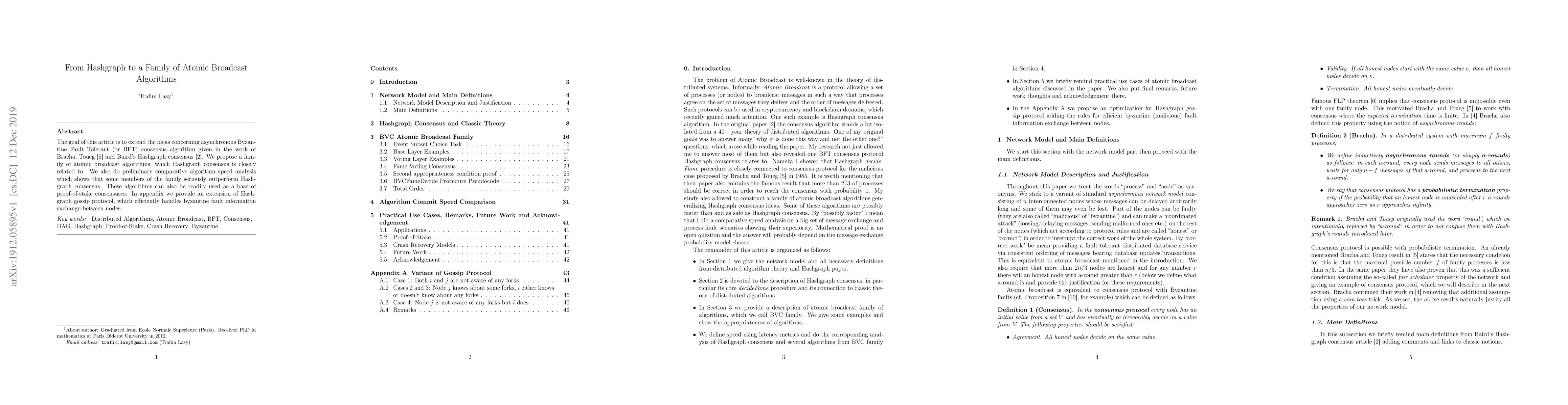 The goal of this article is to extend the ideas concerning Bracha-Toueg asynchronous Byzantine Fault Tolerant consensus algorithm and Baird's Hashgraph consensus. We propose a family of atomic broadcast algorithms, which Hashgraph consensus is closely related to. We also do preliminary comparative algorithm speed analysis which shows that some members of the family seriously outperform Hashgraph consensus. These algorithms can also be readily used as a base of proof-of-stake consensuses. In appendix we provide an extension of Hashgraph gossip protocol, which efficiently handles byzantine fault information exchange between nodes.
