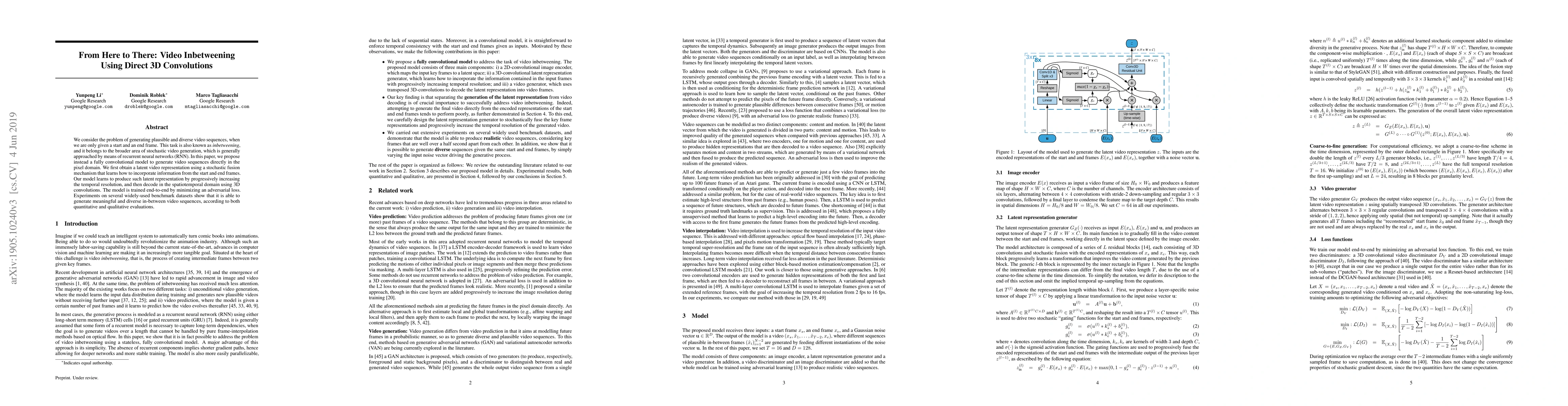 This paper proposes a fully convolutional model for video inbetweening using direct 3D convolutions, which generates plausible video sequences directly from start and end frames. The model employs a stochastic fusion mechanism and adversarial training to produce diverse and meaningful in-between frames.