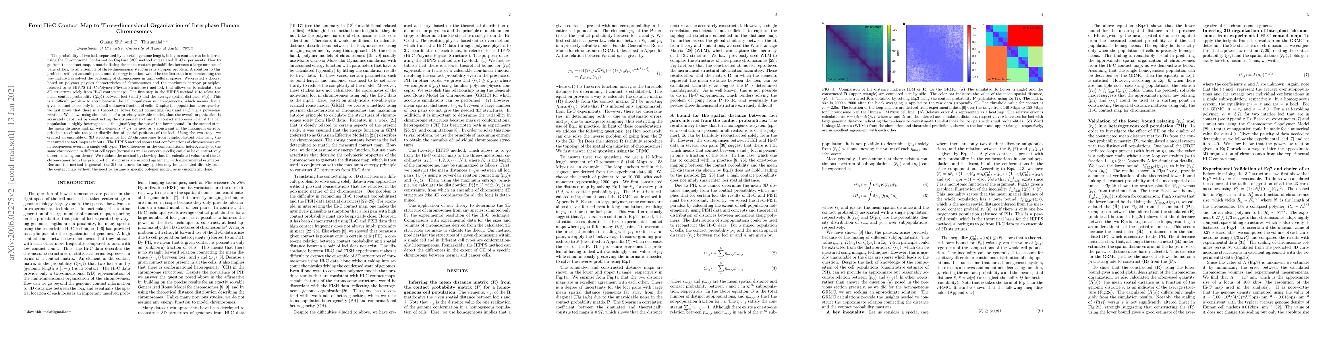 The probability of two loci, separated by a certain genome length, being in contact can be inferred using the Chromosome Conformation Capture (3C) method and related Hi-C experiments. How to go from the contact map, a matrix listing the mean contact probabilities between a large number of pairs of loci, to an ensemble of three-dimensional structures is an open problem. A solution to this problem, without assuming an assumed energy function, would be the first step in understanding the way nature has solved the packaging of chromosomes in tight cellular spaces. We created a theory, based on polymer physics characteristics of chromosomes and the maximum entropy principles, referred to as HIPPS (Hi-C-Polymer-Physics-Structures) method, that allows us to calculate the 3D structures solely from Hi-C contact maps. We created an ensemble of 3D structures for the 23 chromosomes from lymphoblastoid cells using the measured contact maps as inputs. The HIPPS method shows that conformations of chromosomes are heterogeneous even in a single cell type. The differences in the conformational heterogeneity of the same chromosome in different cell types (normal as well as cancerous cells) can also be quantitatively discerned using our theory. We validate the method by showing that the calculated volumes of the 23 chromosomes from the predicted 3D structures are in good agreement with experimental estimates. Because the method is general, the 3D structures for any species may be calculated directly from the contact map without the need to assume a specific polymer model, as is customarily done.