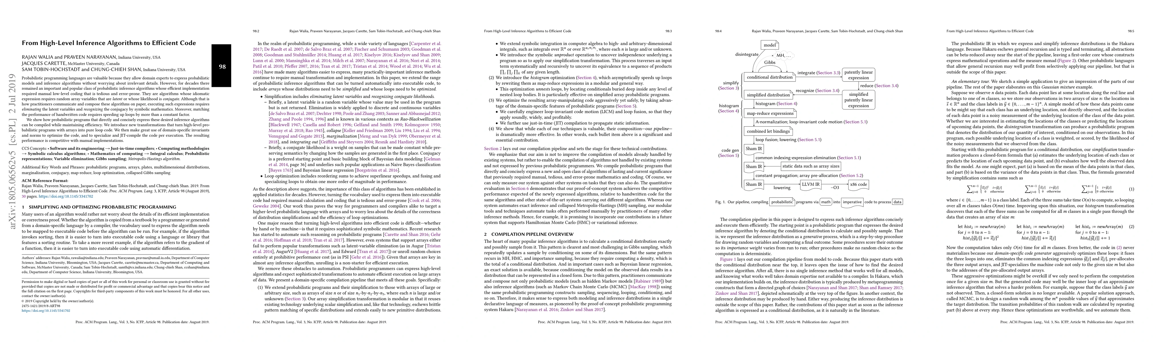 This research introduces a method to compile high-level probabilistic programs, which express complex inference algorithms, into efficient loop code. It achieves this by applying new transformations and leveraging domain-specific invariants for optimization. The resulting performance is comparable to manually written, optimized code.