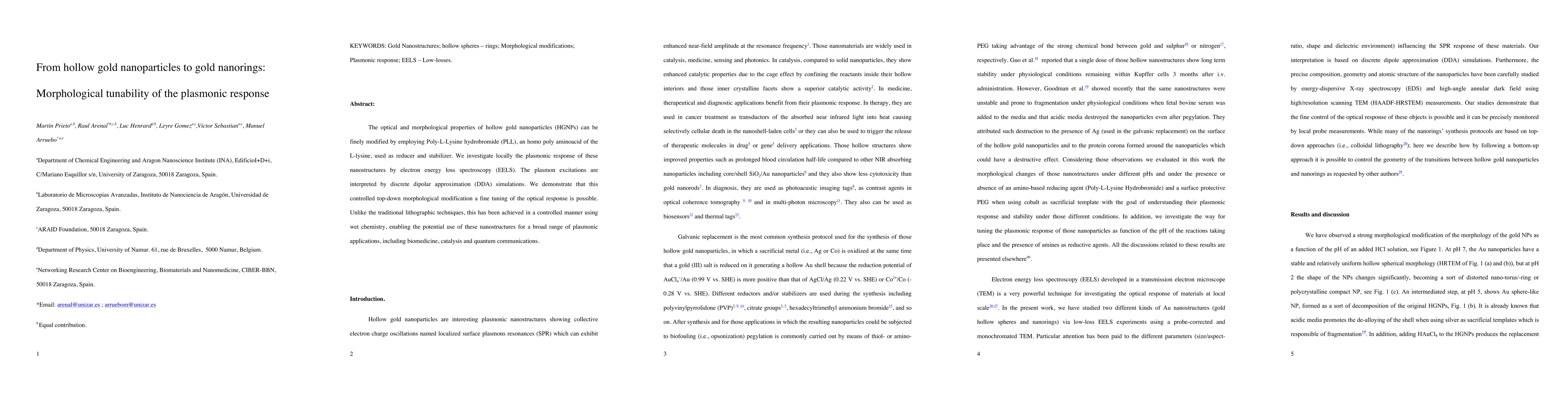 The optical and morphological properties of hollow gold nanoparticles (HGNPs) can be finely modified by employing Poly-L-Lysine hydrobromide (PLL), an homo poly aminoacid of the L-lysine, used as reducer and stabilizer. We investigate locally the plasmonic response of these nanostructures by electron energy loss spectroscopy (EELS). The plasmon excitations are interpreted by discrete dipolar approximation (DDA) simulations. We demonstrate that this controlled top-down morphological modification a fine tuning of the optical response is possible. Unlike the traditional lithographic techniques, this has been achieved in a controlled manner using wet chemistry, enabling the potential use of these nanostructures for a broad range of plasmonic applications, including biomedicine, catalysis and quantum communications.