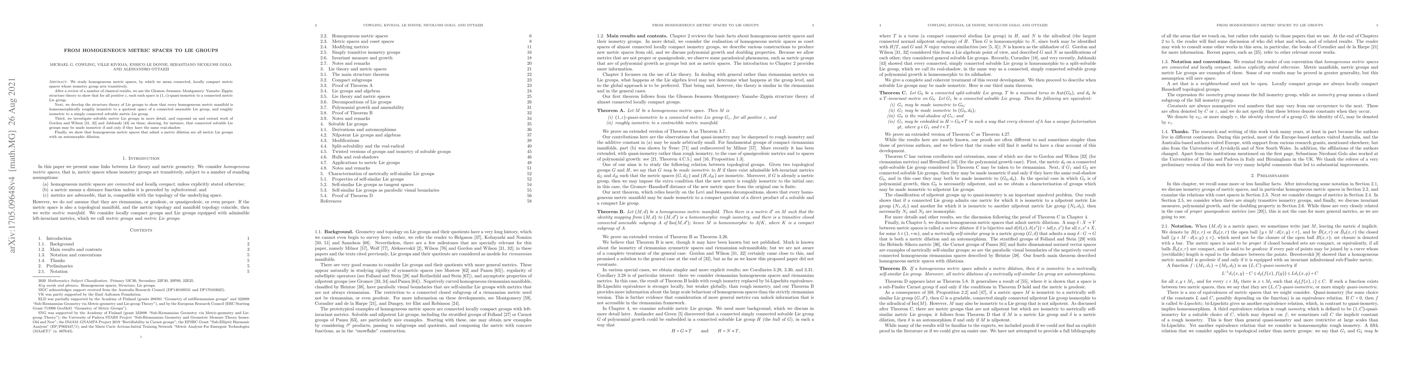 We study homogeneous metric spaces, by which we mean connected, locally compact metric spaces whose isometry group acts transitively. After a review of some classical results, we use the Gleason-Iwasawa-Montgomery-Yamabe-Zippin structure theory to show that for all positive $\epsilon$, each such space is $(1,\epsilon)$-quasi-isometric to a connected metric Lie group. Next, we develop the structure theory of Lie groups to show that every homogeneous metric manifold is homeomorphically roughly isometric to a quotient space of a connected amenable Lie group, and roughly isometric to a simply connected solvable metric Lie group. Third, we investigate solvable metric Lie groups in more detail, and expound on and extend work of Gordon and Wilson and of Jablonski on these, showing, for instance, that connected, simply connected solvable Lie groups may be made isometric if and only if they have the same real-shadow. Finally, we extend a result of Kivioja and Le Donne to show that homogeneous metric spaces that admit a metric dilation are all metric Lie groups with an automorphic dilation.