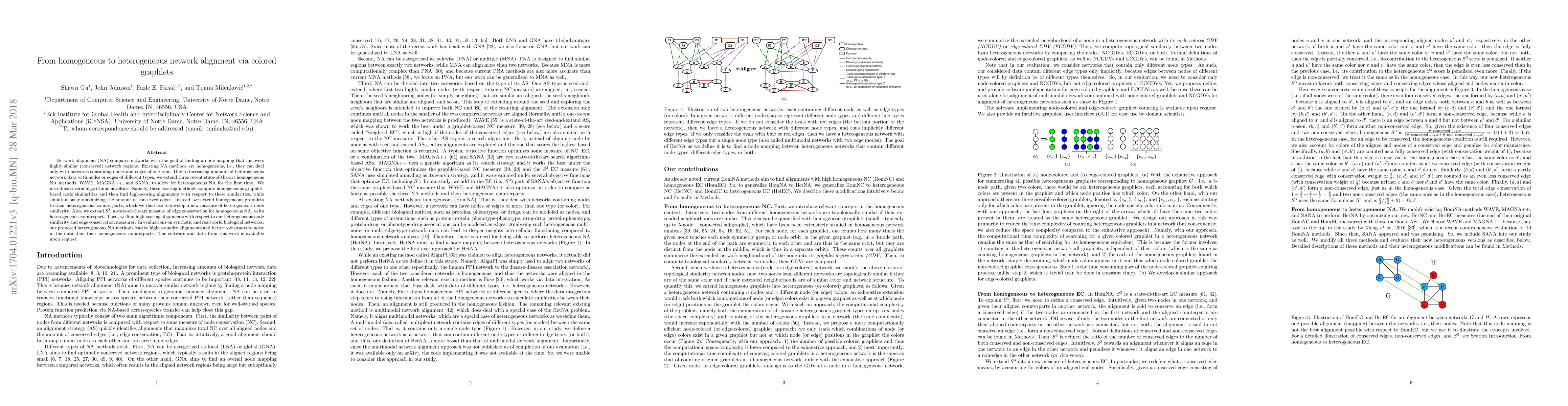 This paper extends three state-of-the-art homogeneous network alignment methods to handle heterogeneous networks by introducing colored graphlets and a new measure of heterogeneous node similarity, achieving higher-quality alignments and better noise robustness. The extended methods outperform their homogeneous counterparts in evaluations on synthetic and real-world biological networks.