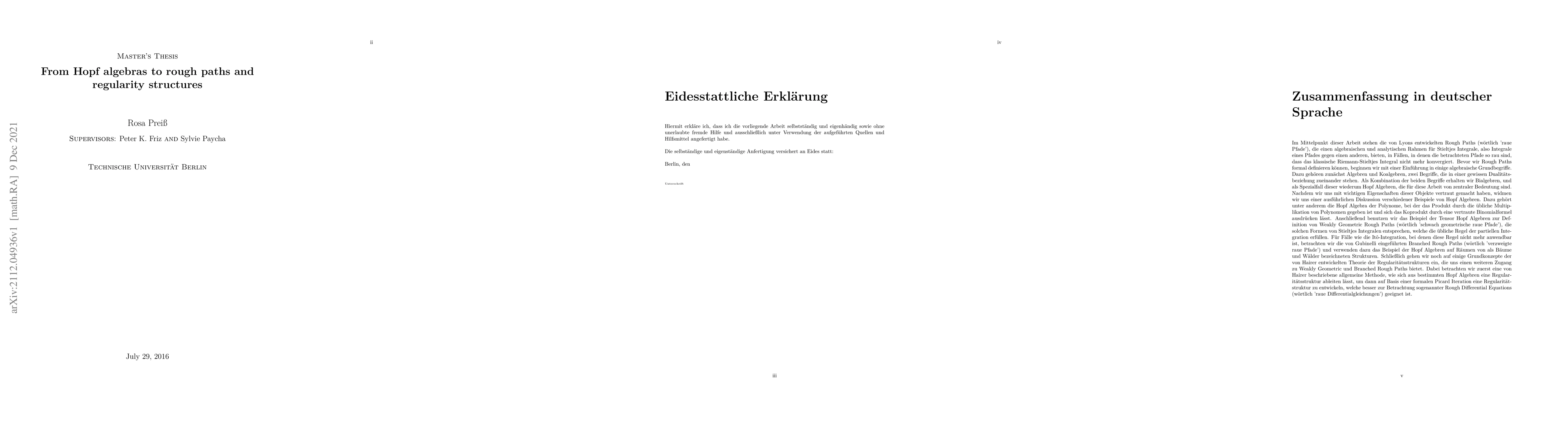 Lyon's rough paths give an algebraic and analytic framework for Stieltjes integrals in a regime of low regularity where the usual Riemann-Stieltjes integral does not converge. Before we may rigorously define rough paths, we start with the introduction of some basic algebraic terminology. Among them are algebras and coalgebras, two notions which are in some sense dual to each other. As a combination of these notions we obtain bialgebras, and as a special case of them then Hopf algebras, which play a central role in this thesis. After further algebraic preliminaries, we give the examples of Hopf algebras we are interested in. Among them is the example of the polynomial Hopf algebra, whose product is nothing but the usual multiplication of polynomials and whose coproduct can be expressed very simply with the help of a binomial coefficient. We then use the dual pair of tensor Hopf algebras to introduce weakly geometric rough paths, which correspond to notions of Stieltjes integrals satisfying the usual integration by parts rule. For cases like It\^o-integration where we need to give up integration by parts, we look at Gubinelli's branched rough paths based on the dual pair of Hopf algebras on trees and forests. Finally, we give some basic concepts of Hairer's theory of regularity structures and use them for a different approach to branched and weakly geometric rough paths. While we first look at a general method described by Hairer to derive a regularity structure from certain Hopf algebras, we then develop a regularity structure based on a formal Picard iteration which is more suitable for dealing with rough differential equations. This work was written as a master's thesis supervised by Peter Friz and Sylvie Paycha and submitted to TU Berlin on July 29 2016. As of 2021, it does not provide novel research material, but can still be used as an algebra-focussed introduction to the subject.