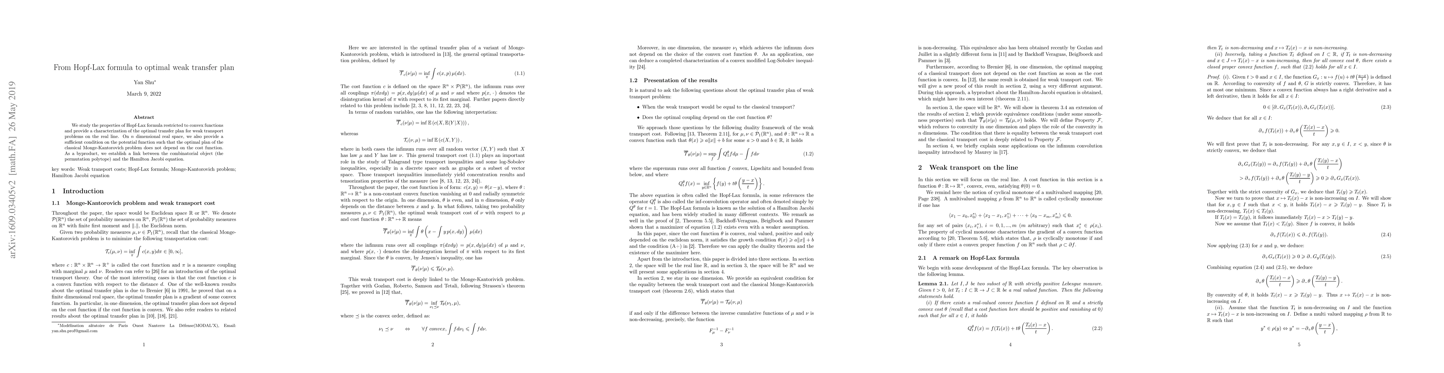 This paper characterizes the optimal transfer plan for weak transport problems using the Hopf-Lax formula, a mathematical tool that helps solve transport-related optimization problems. It focuses on convex functions and explores their properties to achieve an optimal solution.