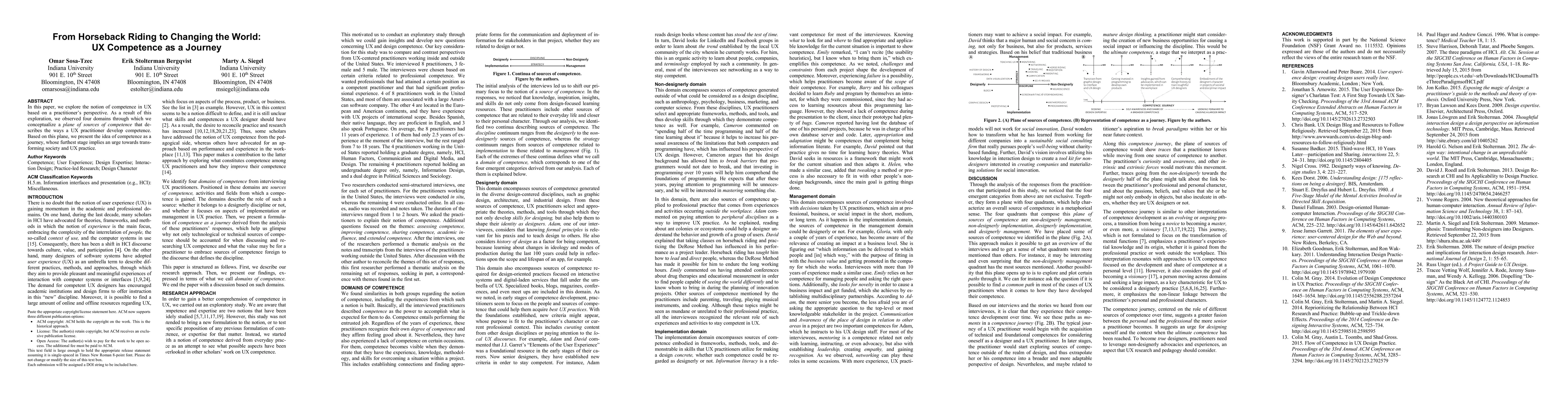 In this paper, we explore the notion of competence in UX based on the perspective of practitioners. As a result of this exploration, we observed four domains through which we conceptualize a plan of sources of competence that describes the ways a UX practitioner develop competence. Based on this plane, we present the idea of competence as a journey. A journey whose furthest stage implies an urge towards transforming society and UX practice.