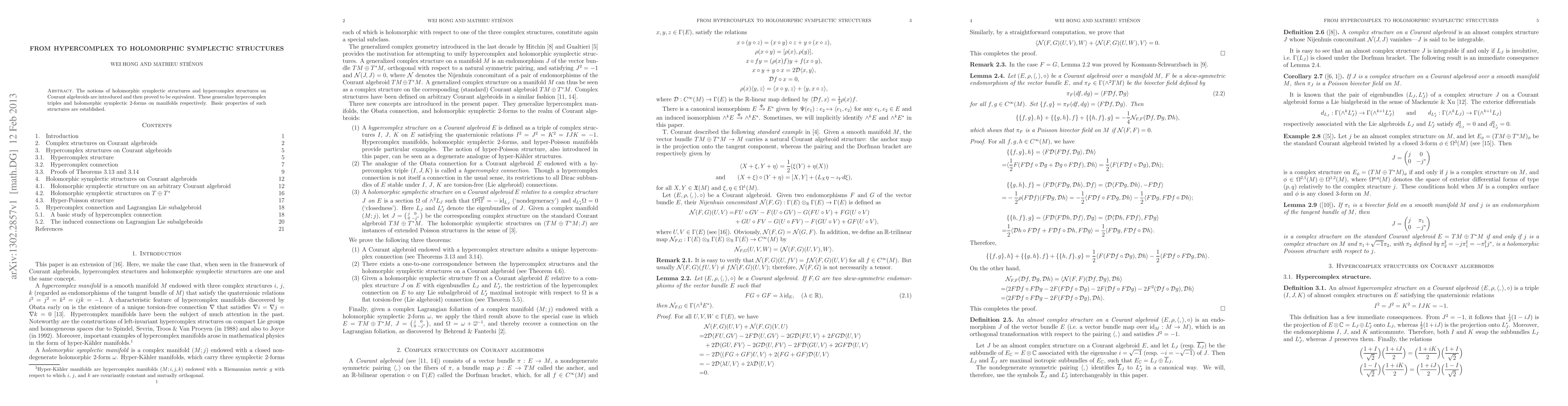 The paper establishes the equivalence between holomorphic symplectic structures and hypercomplex structures on Courant algebroids, generalizing both hypercomplex triples and holomorphic symplectic 2-forms on manifolds, and outlines their fundamental properties.