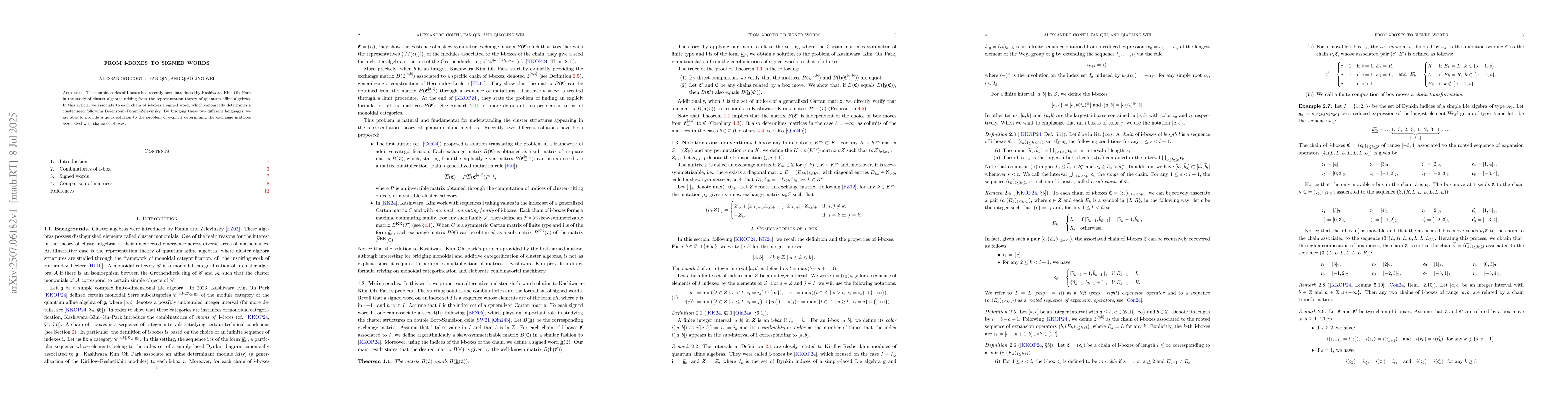 The combinatorics of i-boxes has recently been introduced by Kashiwara--Kim--Oh--Park in the study of cluster algebras arising from the representation theory of quantum affine algebras. In this article, we associate to each chain of i-boxes a signed word, which canonically determines a cluster seed following Berenstein--Fomin--Zelevinsky. By bridging these two different languages, we are able to provide a quick solution to the problem of explicit determining the exchange matrices associated with chains of i-boxes.