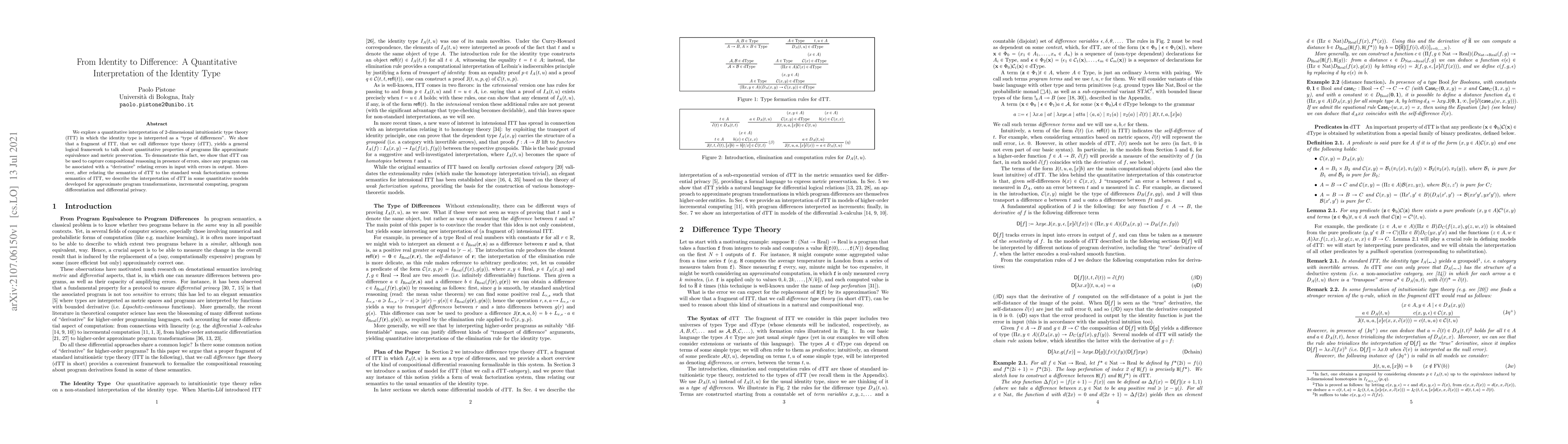 We explore a quantitative interpretation of 2-dimensional intuitionistic type theory (ITT) in which the identity type is interpreted as a "type of differences". We show that a fragment of ITT, that we call difference type theory (dTT), yields a general logical framework to talk about quantitative properties of programs like approximate equivalence and metric preservation. To demonstrate this fact, we show that dTT can be used to capture compositional reasoning in presence of errors, since any program can be associated with a "derivative" relating errors in input with errors in output. Moreover, after relating the semantics of dTT to the standard weak factorization systems semantics of ITT, we describe the interpretation of dTT in some quantitative models developed for approximate program transformations, incremental computing, program differentiation and differential privacy.