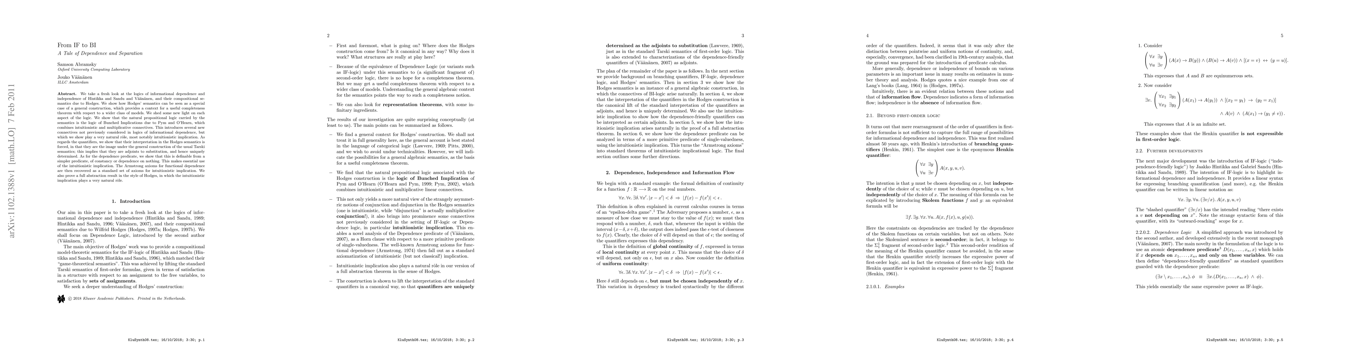 We take a fresh look at the logics of informational dependence and independence of Hintikka and Sandu and Vaananen, and their compositional semantics due to Hodges. We show how Hodges' semantics can be seen as a special case of a general construction, which provides a context for a useful completeness theorem with respect to a wider class of models. We shed some new light on each aspect of the logic. We show that the natural propositional logic carried by the semantics is the logic of Bunched Implications due to Pym and O'Hearn, which combines intuitionistic and multiplicative connectives. This introduces several new connectives not previously considered in logics of informational dependence, but which we show play a very natural role, most notably intuitionistic implication. As regards the quantifiers, we show that their interpretation in the Hodges semantics is forced, in that they are the image under the general construction of the usual Tarski semantics; this implies that they are adjoints to substitution, and hence uniquely determined. As for the dependence predicate, we show that this is definable from a simpler predicate, of constancy or dependence on nothing. This makes essential use of the intuitionistic implication. The Armstrong axioms for functional dependence are then recovered as a standard set of axioms for intuitionistic implication. We also prove a full abstraction result in the style of Hodges, in which the intuitionistic implication plays a very natural r\^ole.