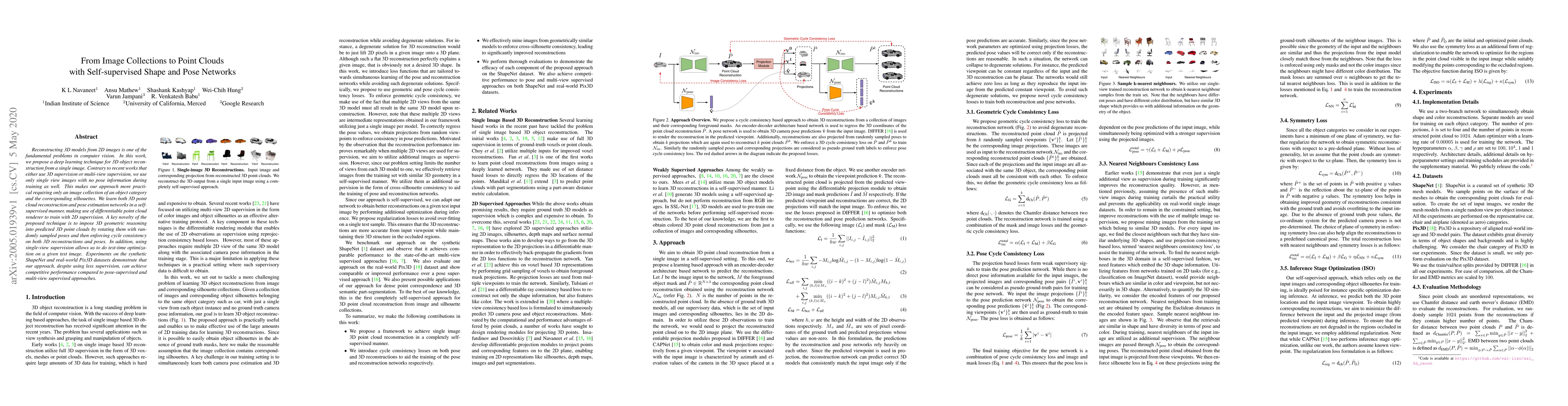 This paper proposes a self-supervised deep learning method for reconstructing 3D point clouds from single 2D images without requiring pose information during training. The technique achieves competitive performance compared to supervised methods by enforcing cycle consistency and utilizing test-time optimization.