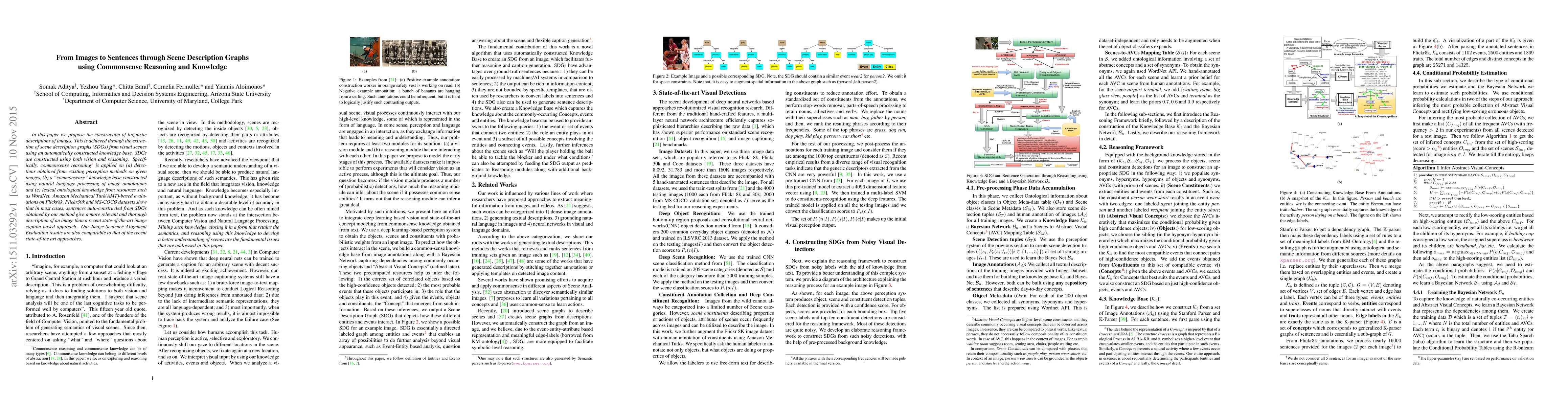 This paper proposes a method to generate linguistic descriptions of images using scene description graphs (SDGs) constructed via commonsense reasoning and knowledge base. Evaluations show that the auto-generated sentences are more relevant and thorough compared to recent state-of-the-art image captioning methods.