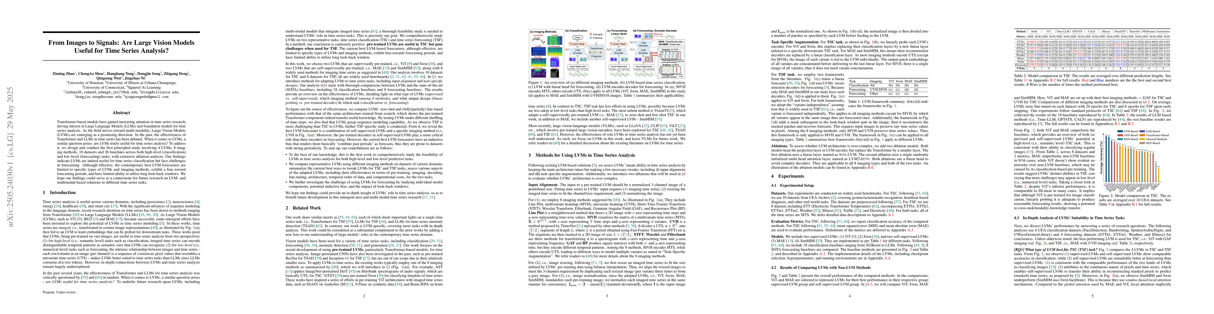 Large Vision Models (LVMs) show promise in time series analysis for classification tasks but struggle with forecasting, with limitations on specific methods and window sizes.