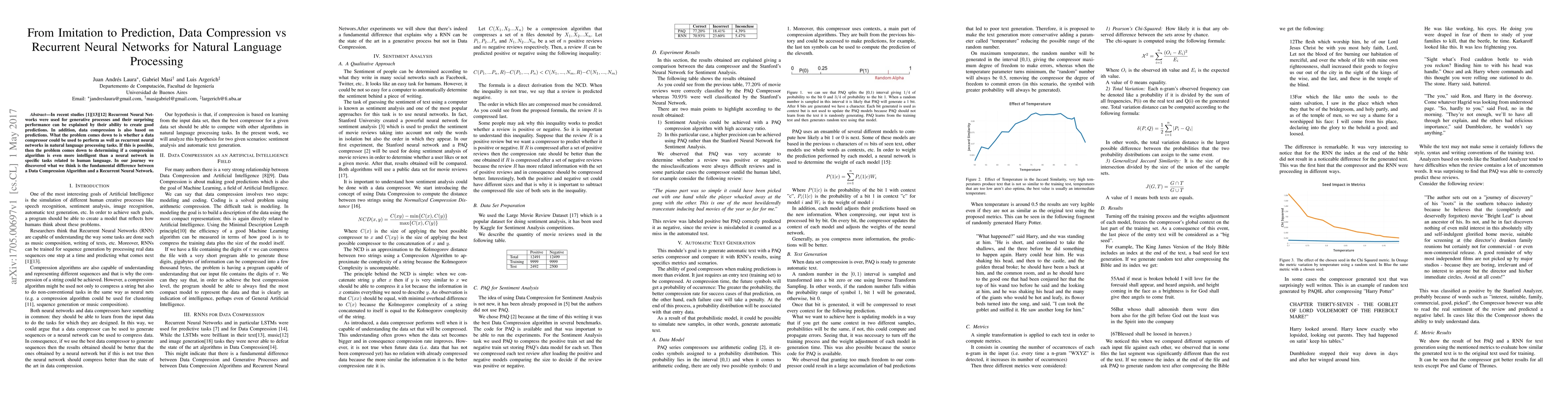 This paper investigates whether data compression algorithms, which rely on predictive models, can outperform Recurrent Neural Networks (RNNs) in natural language processing tasks. The study highlights the fundamental differences between these two approaches and explores their relative efficiencies in language-related tasks.