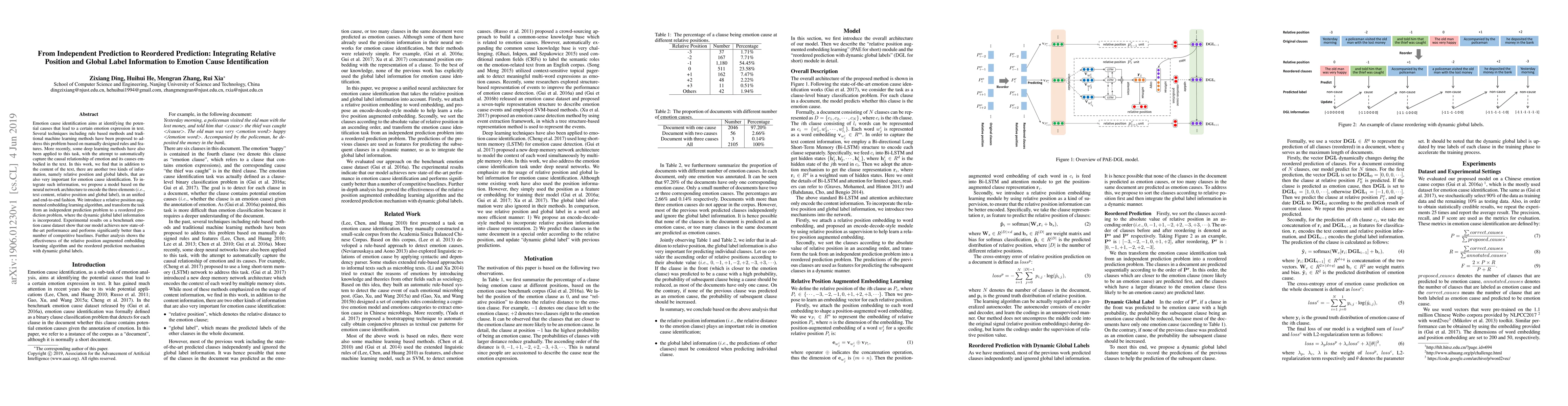 Emotion cause identification aims at identifying the potential causes that lead to a certain emotion expression in text. Several techniques including rule based methods and traditional machine learning methods have been proposed to address this problem based on manually designed rules and features. More recently, some deep learning methods have also been applied to this task, with the attempt to automatically capture the causal relationship of emotion and its causes embodied in the text. In this work, we find that in addition to the content of the text, there are another two kinds of information, namely relative position and global labels, that are also very important for emotion cause identification. To integrate such information, we propose a model based on the neural network architecture to encode the three elements ($i.e.$, text content, relative position and global label), in an unified and end-to-end fashion. We introduce a relative position augmented embedding learning algorithm, and transform the task from an independent prediction problem to a reordered prediction problem, where the dynamic global label information is incorporated. Experimental results on a benchmark emotion cause dataset show that our model achieves new state-of-the-art performance and performs significantly better than a number of competitive baselines. Further analysis shows the effectiveness of the relative position augmented embedding learning algorithm and the reordered prediction mechanism with dynamic global labels.