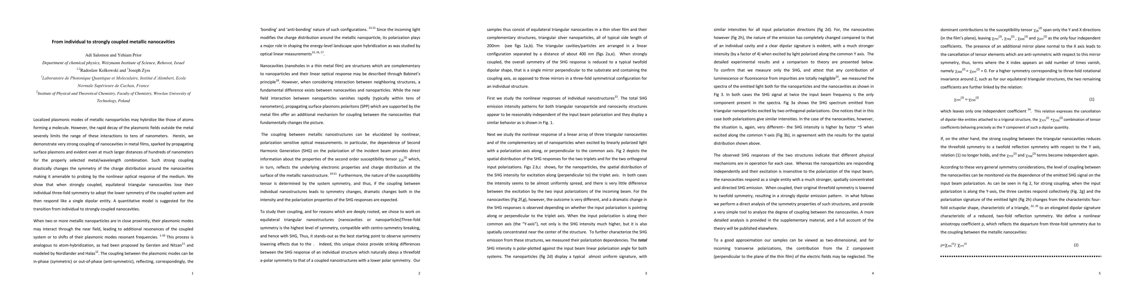 Localized plasmonic modes of metallic nanoparticles may hybridize like those of atoms forming a molecule. However, the rapid decay of the plasmonic fields outside the metal severely limits the range of these interactions to tens of nanometers. Herein, we demonstrate very strong coupling of nanocavities in metal films, sparked by propagating surface plasmons and evident even at much larger distances of hundreds of nanometers for the properly selected metal/wavelength combination. Such strong coupling drastically changes the symmetry of the charge distribution around the nanocavities making it amenable to probing by the nonlinear optical response of the medium. We show that when strongly coupled, equilateral triangular nanocavities lose their individual three-fold symmetry to adopt the lower symmetry of the coupled system and then respond like a single dipolar entity. A quantitative model is suggested for the transition from individual to strongly coupled nanocavities.