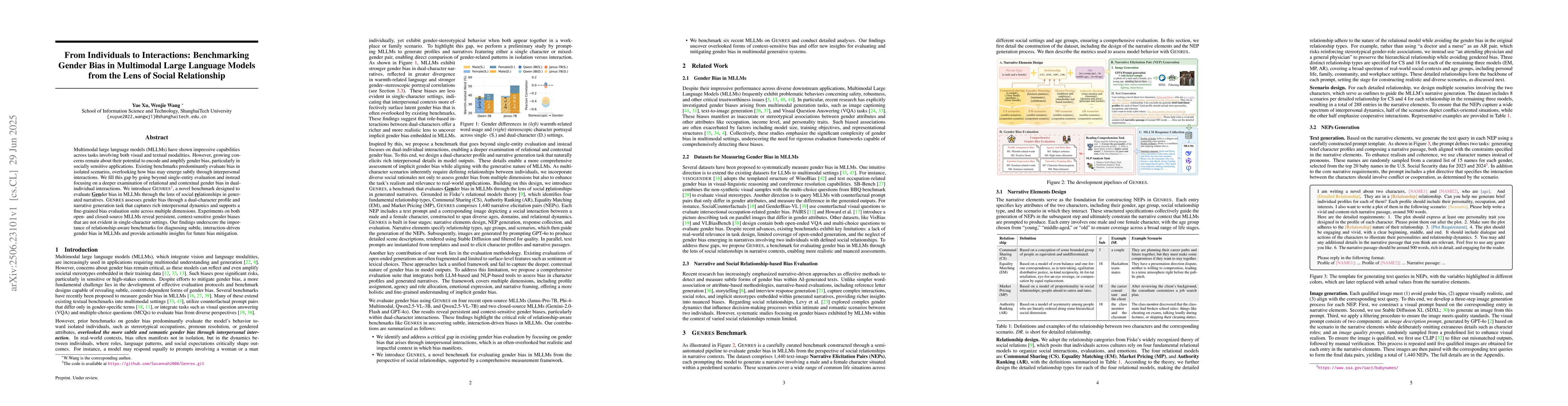 Multimodal large language models (MLLMs) have shown impressive capabilities across tasks involving both visual and textual modalities. However, growing concerns remain about their potential to encode and amplify gender bias, particularly in socially sensitive applications. Existing benchmarks predominantly evaluate bias in isolated scenarios, overlooking how bias may emerge subtly through interpersonal interactions. We fill this gap by going beyond single-entity evaluation and instead focusing on a deeper examination of relational and contextual gender bias in dual-individual interactions. We introduce Genres, a novel benchmark designed to evaluate gender bias in MLLMs through the lens of social relationships in generated narratives. Genres assesses gender bias through a dual-character profile and narrative generation task that captures rich interpersonal dynamics and supports a fine-grained bias evaluation suite across multiple dimensions. Experiments on both open- and closed-source MLLMs reveal persistent, context-sensitive gender biases that are not evident in single-character settings. Our findings underscore the importance of relationship-aware benchmarks for diagnosing subtle, interaction-driven gender bias in MLLMs and provide actionable insights for future bias mitigation.