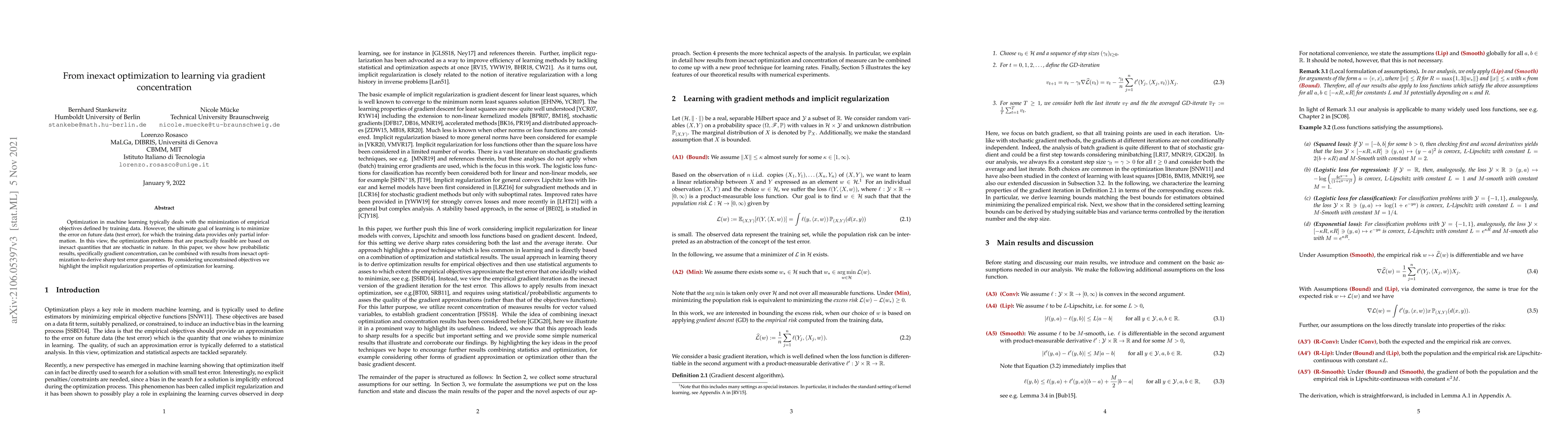 Optimization in machine learning typically deals with the minimization of empirical objectives defined by training data. However, the ultimate goal of learning is to minimize the error on future data (test error), for which the training data provides only partial information. In this view, the optimization problems that are practically feasible are based on inexact quantities that are stochastic in nature. In this paper, we show how probabilistic results, specifically gradient concentration, can be combined with results from inexact optimization to derive sharp test error guarantees. By considering unconstrained objectives we highlight the implicit regularization properties of optimization for learning.