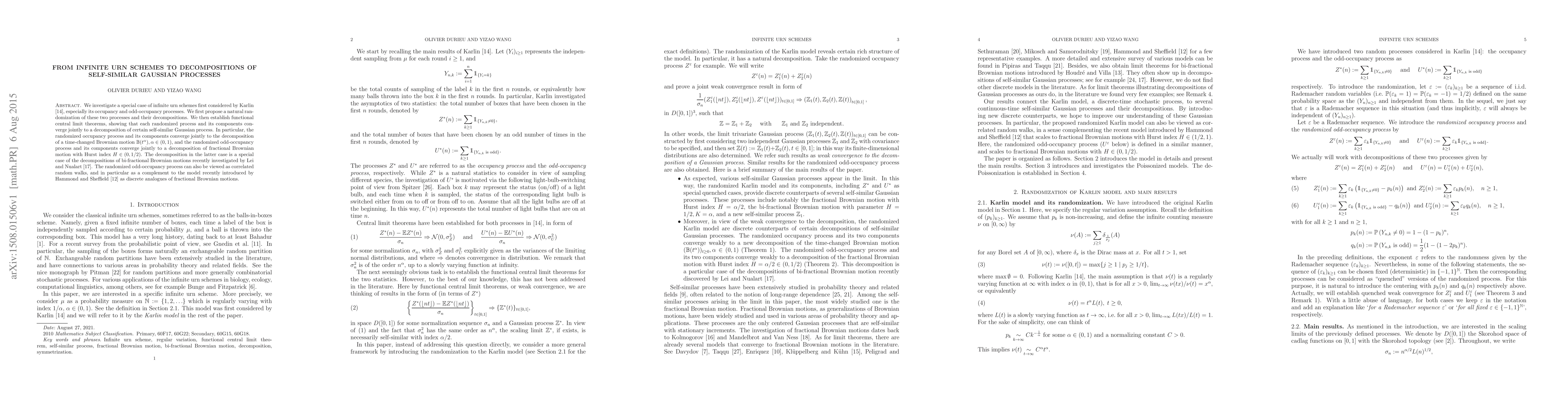 We investigate a special case of infinite urn schemes first considered by Karlin (1967), especially its occupancy and odd-occupancy processes. We first propose a natural randomization of these two processes and their decompositions. We then establish functional central limit theorems, showing that each randomized process and its components converge jointly to a decomposition of certain self-similar Gaussian process. In particular, the randomized occupancy process and its components converge jointly to the decomposition of a time-changed Brownian motion $\mathbb B(t^\alpha), \alpha\in(0,1)$, and the randomized odd-occupancy process and its components converge jointly to a decomposition of fractional Brownian motion with Hurst index $H\in(0,1/2)$. The decomposition in the latter case is a special case of the decompositions of bi-fractional Brownian motions recently investigated by Lei and Nualart (2009). The randomized odd-occupancy process can also be viewed as correlated random walks, and in particular as a complement to the model recently introduced by Hammond and Sheffield (2013) as discrete analogues of fractional Brownian motions.