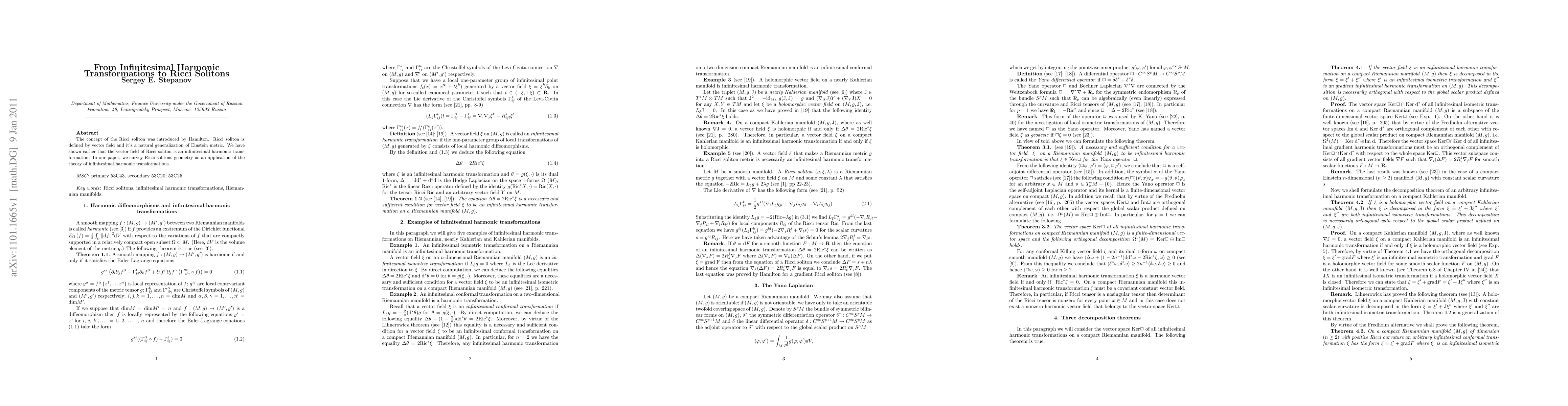 The concept of the Ricci soliton was introduced by Hamilton. Ricci soliton is defined by vector field and it's a natural generalization of Einstein metric. We have shown earlier that the vector field of Ricci soliton is an infinitesimal harmonic transformation. In our paper, we survey Ricci solitons geometry as an application of the theory of infinitesimal harmonic transformations.