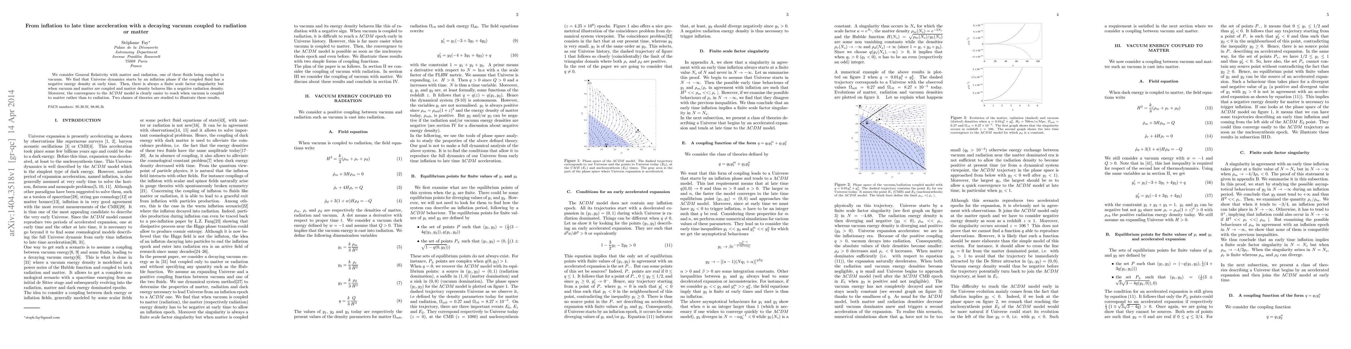 We consider General Relativity with matter and radiation, one of these fluids being coupled to vacuum. We find that Universe dynamics starts by an inflation phase if the coupled fluid has a negative energy density at early time. Then, there is always a finite scale factor singularity but when vacuum and matter are coupled and matter density behaves like a negative radiation density. Moreover, the convergence to the LCDM model is clearly easier to reach when vacuum is coupled to matter rather than to radiation. Two classes of theories are studied to illustrate these results.