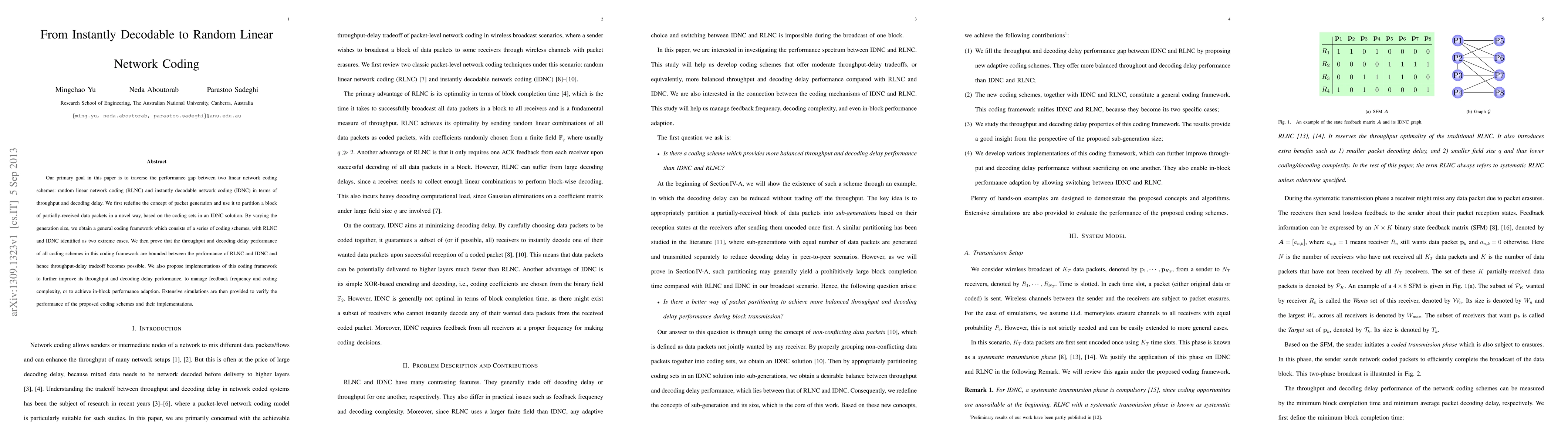 Our primary goal in this paper is to traverse the performance gap between two linear network coding schemes: random linear network coding (RLNC) and instantly decodable network coding (IDNC) in terms of throughput and decoding delay. We first redefine the concept of packet generation and use it to partition a block of partially-received data packets in a novel way, based on the coding sets in an IDNC solution. By varying the generation size, we obtain a general coding framework which consists of a series of coding schemes, with RLNC and IDNC identified as two extreme cases. We then prove that the throughput and decoding delay performance of all coding schemes in this coding framework are bounded between the performance of RLNC and IDNC and hence throughput-delay tradeoff becomes possible. We also propose implementations of this coding framework to further improve its throughput and decoding delay performance, to manage feedback frequency and coding complexity, or to achieve in-block performance adaption. Extensive simulations are then provided to verify the performance of the proposed coding schemes and their implementations.