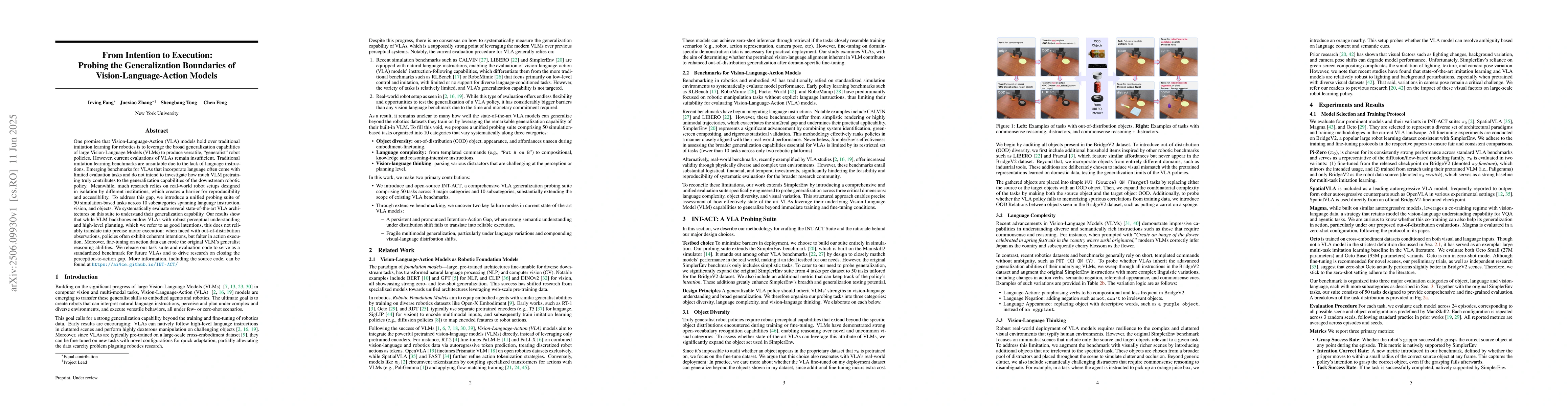 One promise that Vision-Language-Action (VLA) models hold over traditional imitation learning for robotics is to leverage the broad generalization capabilities of large Vision-Language Models (VLMs) to produce versatile, "generalist" robot policies. However, current evaluations of VLAs remain insufficient. Traditional imitation learning benchmarks are unsuitable due to the lack of language instructions. Emerging benchmarks for VLAs that incorporate language often come with limited evaluation tasks and do not intend to investigate how much VLM pretraining truly contributes to the generalization capabilities of the downstream robotic policy. Meanwhile, much research relies on real-world robot setups designed in isolation by different institutions, which creates a barrier for reproducibility and accessibility. To address this gap, we introduce a unified probing suite of 50 simulation-based tasks across 10 subcategories spanning language instruction, vision, and objects. We systematically evaluate several state-of-the-art VLA architectures on this suite to understand their generalization capability. Our results show that while VLM backbones endow VLAs with robust perceptual understanding and high level planning, which we refer to as good intentions, this does not reliably translate into precise motor execution: when faced with out-of-distribution observations, policies often exhibit coherent intentions, but falter in action execution. Moreover, finetuning on action data can erode the original VLM's generalist reasoning abilities. We release our task suite and evaluation code to serve as a standardized benchmark for future VLAs and to drive research on closing the perception-to-action gap. More information, including the source code, can be found at https://ai4ce.github.io/INT-ACT/