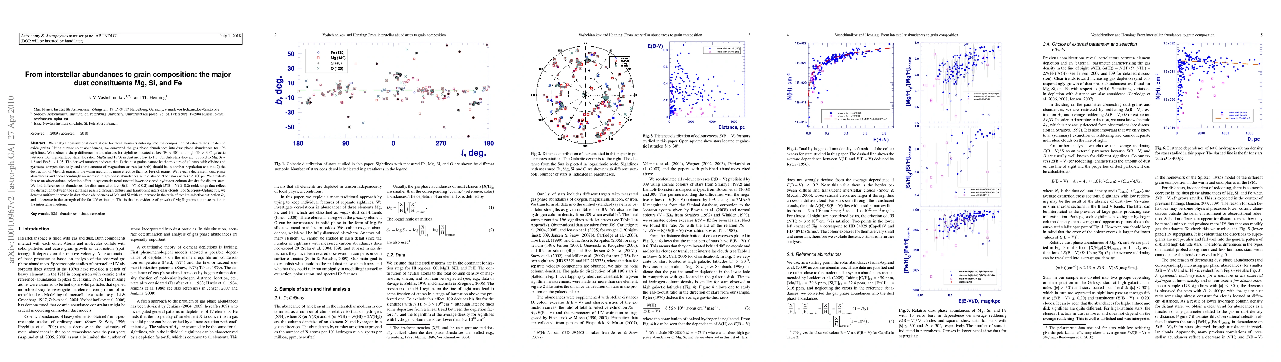 This paper analyzes the abundances of Mg, Si, and Fe in interstellar dust grains, finding significant differences between low and high galactic latitudes. It concludes that the dust composition varies with distance and reddening, suggesting that Mg-rich grains are more efficiently destroyed than Fe-rich ones, and provides evidence for grain growth via accretion in the interstellar medium.