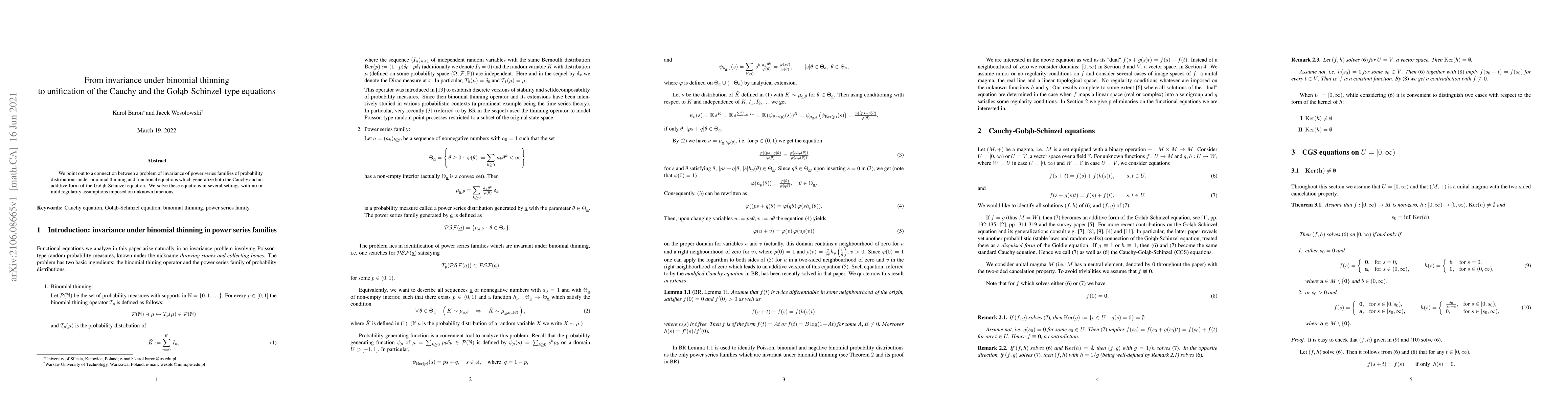 This research paper establishes a connection between binomial thinning and functional equations, solving them with minimal regularity assumptions, shedding light on the Cauchy and Go{ź}b-Schinzel-type equations.