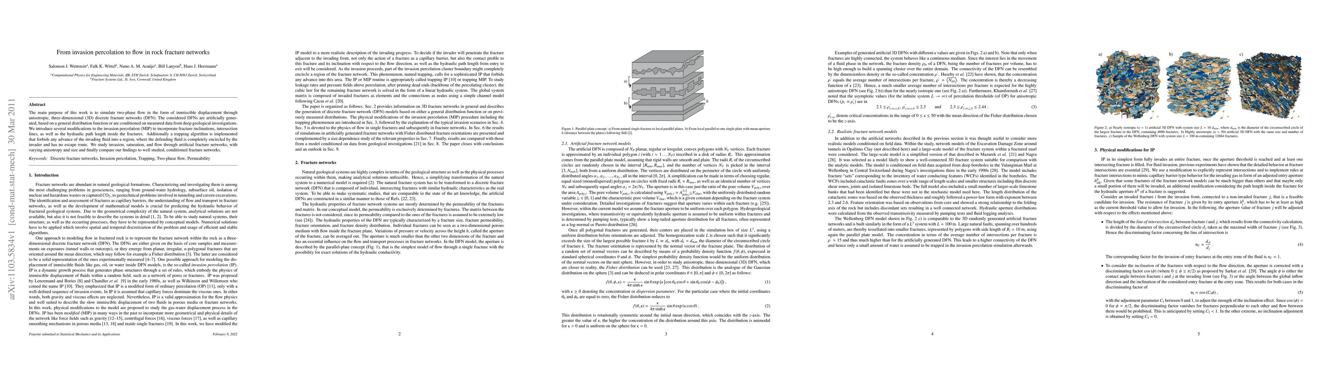 This paper simulates two-phase flow in 3D discrete fracture networks using modified invasion percolation, incorporating fracture inclinations and intersections. It also implements a trapping algorithm to prevent fluid entrapment, and compares results with conditioned fracture networks.