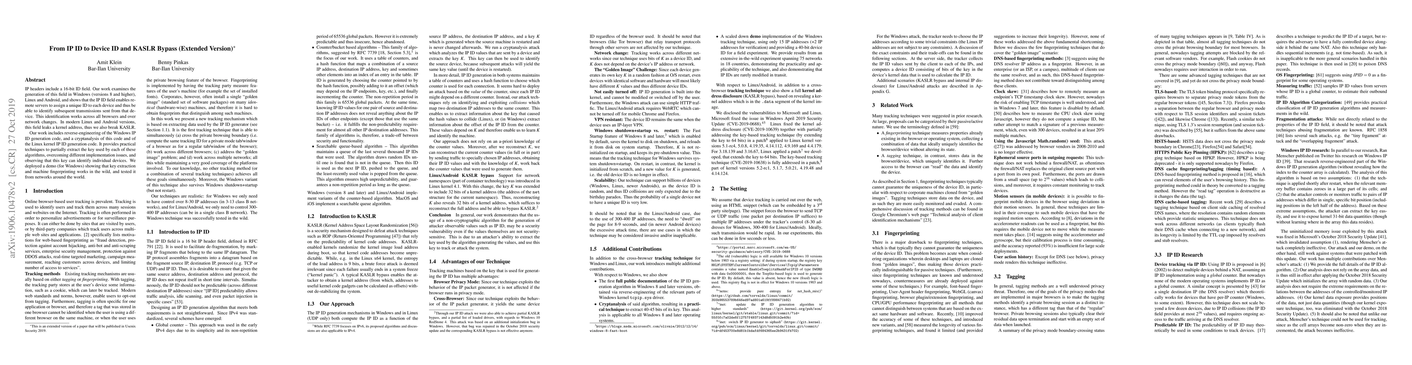 Researchers discovered that IP ID fields in Windows, Linux, and Android can uniquely identify devices across networks, allowing remote servers to track user activity. They also broke Kernel Address Space Layout Randomization (KASLR) in modern versions of these operating systems.