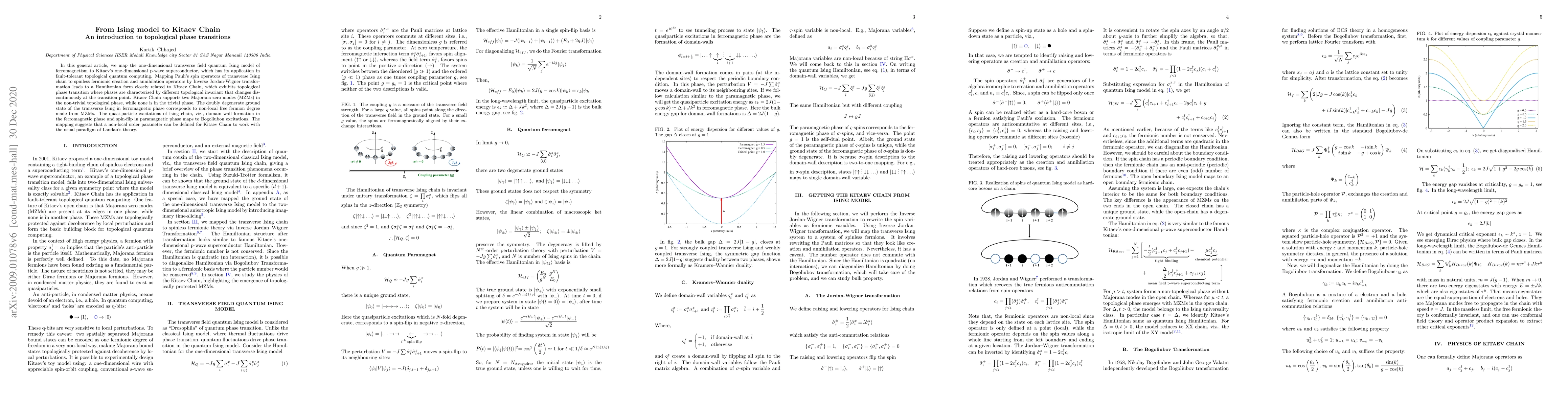 This paper introduces a mapping between the one-dimensional transverse field quantum Ising model and Kitaev's p-wave superconductor, illustrating the topological phase transition. It highlights the emergence of Majorana zero modes in the non-trivial topological phase and proposes a non-local order parameter for Kitaev Chain, aligning with Landau's theory.