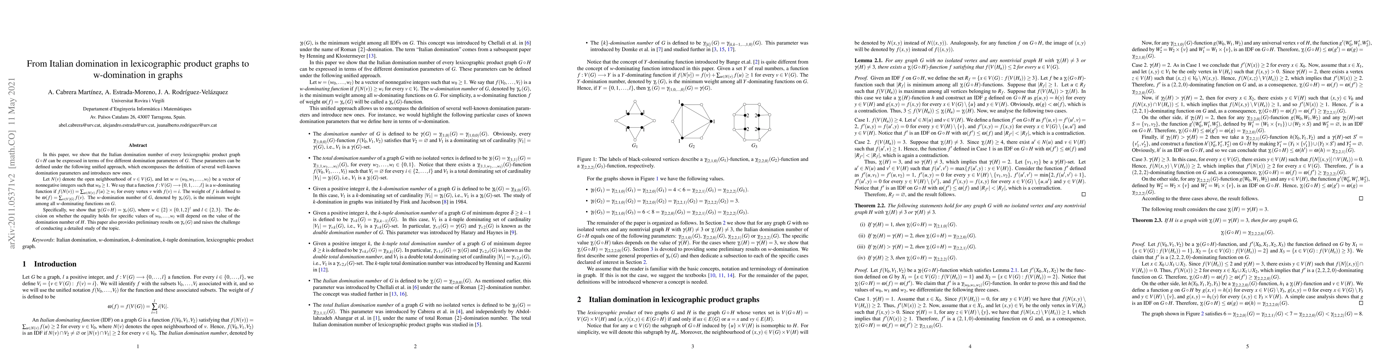 This paper connects the Italian domination number in lexicographic product graphs to a new concept of $w$-domination in graphs. It defines $w$-dominating functions and the associated $w$-domination number, showing that the Italian domination number in such product graphs can be expressed in terms of these new domination parameters.