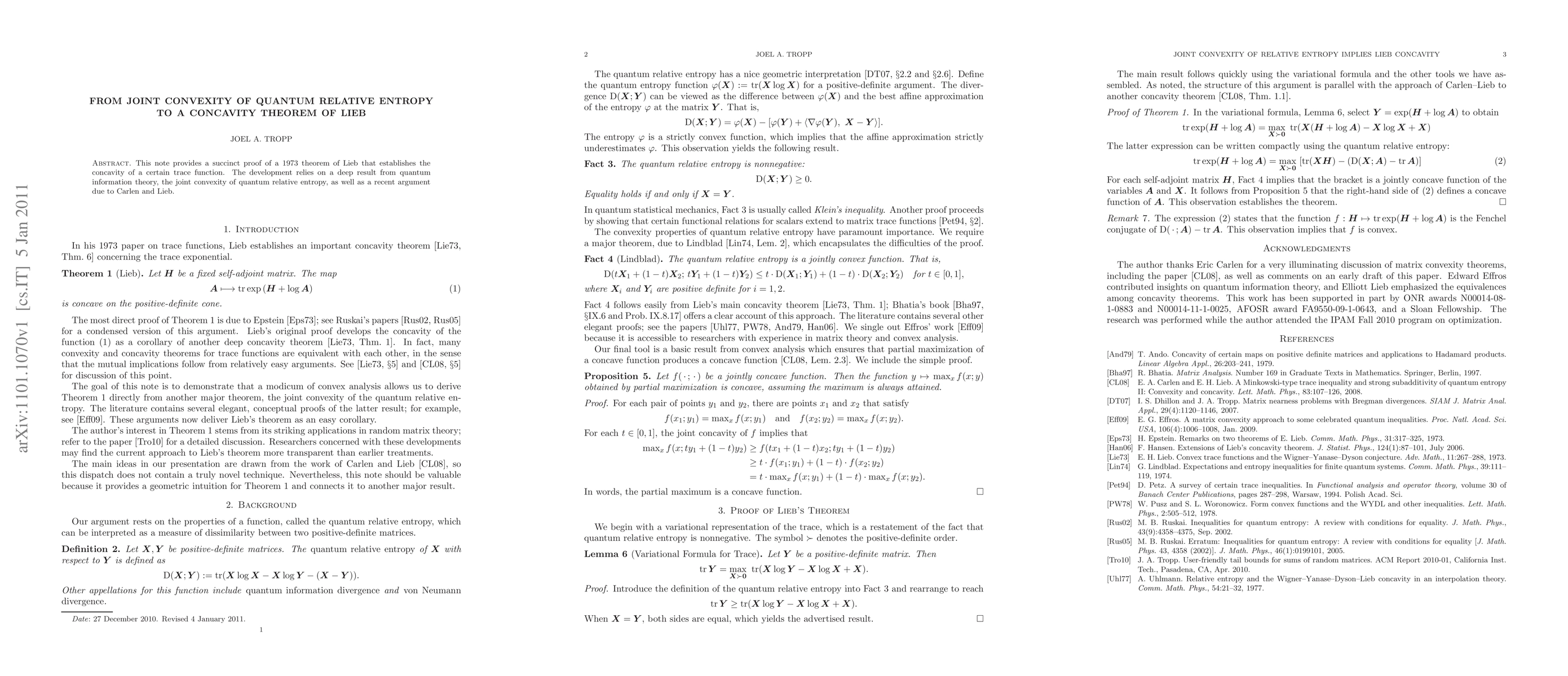 This paper succinctly proves Lieb's 1973 theorem on the concavity of a trace function using the joint convexity of quantum relative entropy and a recent argument by Carlen and Lieb. The result leverages insights from quantum information theory.