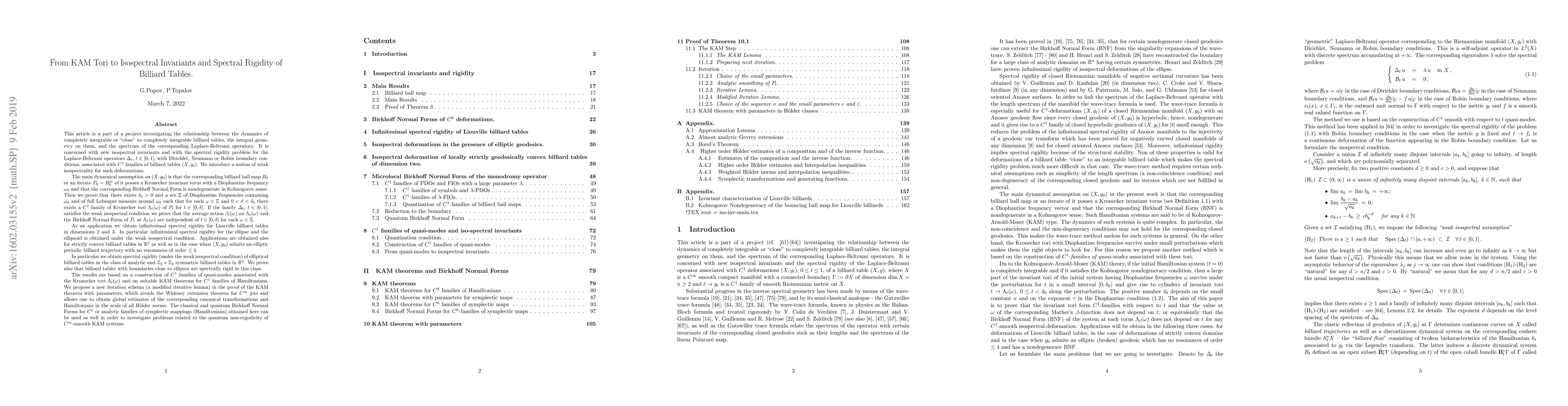 This paper investigates the dynamics of integrable billiard tables and their associated Laplace-Beltrami operators, introducing weak isospectrality and proving spectral rigidity for various billiard table configurations, including Liouville and strictly convex tables, using KAM theorems and quasi-mode constructions.