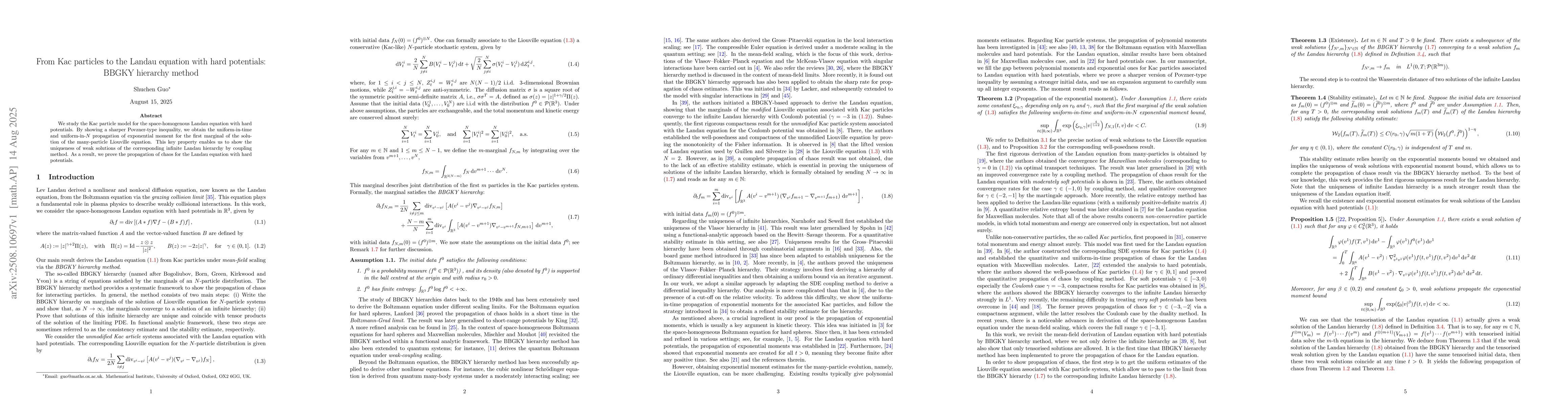 We study the Kac particle model for the space-homogenous Landau equation with hard potentials. By showing a sharper Povzner-type inequality, we obtain the uniform-in-time and uniform-in-N propagation of exponential moment for the first marginal of the solution of the many-particle Liouville equation. This key property enables us to show the uniqueness of weak solutions of the corresponding infinite Landau hierarchy by coupling method. As a result, we prove the propagation of chaos for the Landau equation with hard potentials.