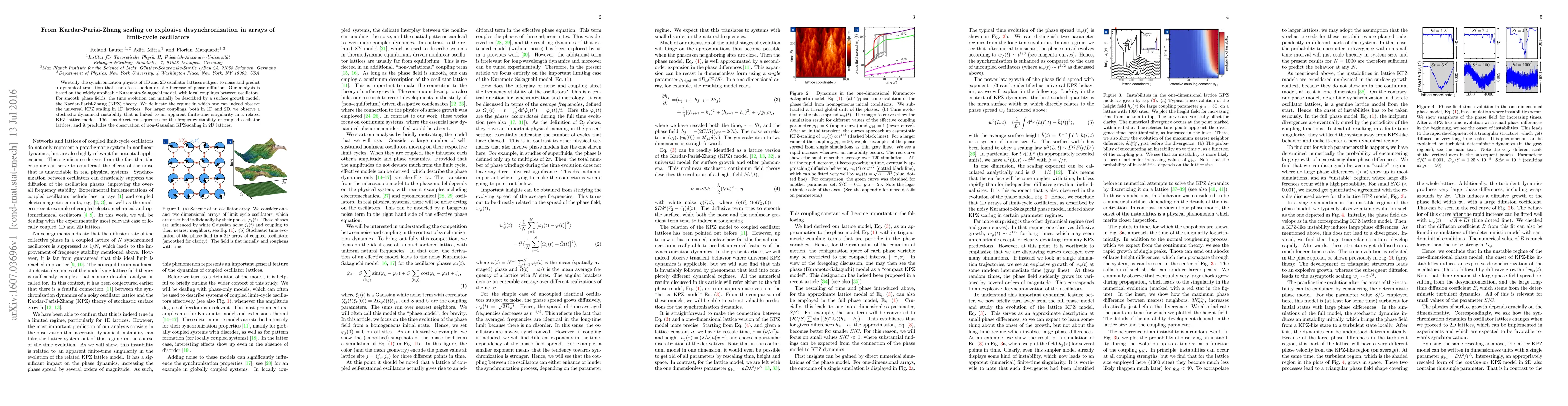 This paper investigates the synchronization dynamics in 1D and 2D arrays of limit-cycle oscillators, revealing a transition from Kardar-Parisi-Zhang (KPZ) scaling to explosive desynchronization under noise. The study predicts a sudden increase in phase diffusion linked to a dynamical instability, impacting frequency stability and precluding non-Gaussian KPZ-scaling in 2D lattices.