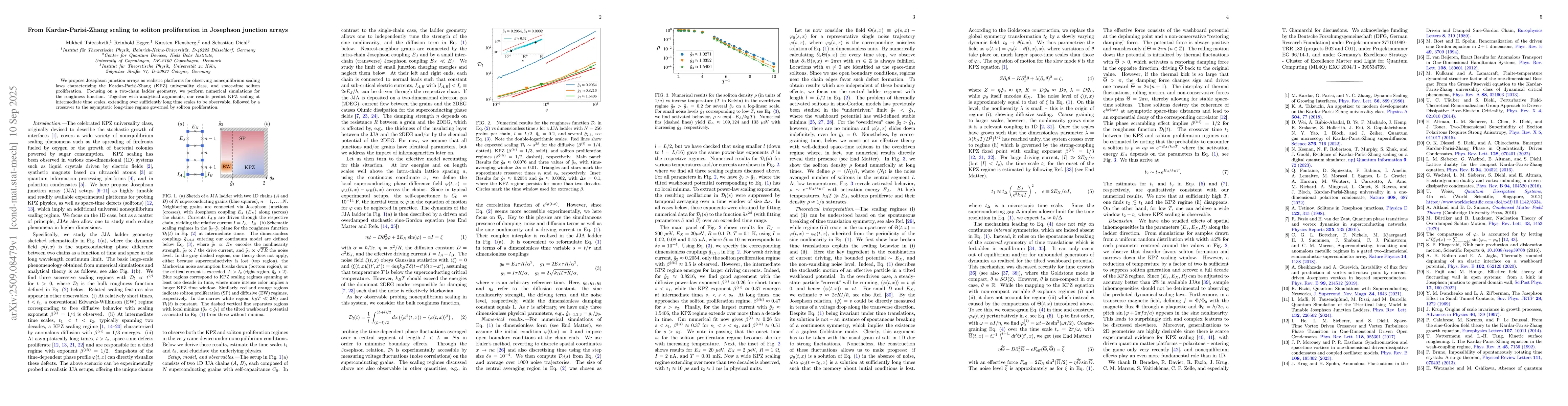 We propose Josephson junction arrays as realistic platforms for observing nonequilibrium scaling laws characterizing the Kardar-Parisi-Zhang (KPZ) universality class, and space-time soliton proliferation. Focusing on a two-chain ladder geometry, we perform numerical simulations for the roughness function. Together with analytical arguments, our results predict KPZ scaling at intermediate time scales, extending over sufficiently long time scales to be observable, followed by a crossover to the asymptotic long-time regime governed by soliton proliferation.