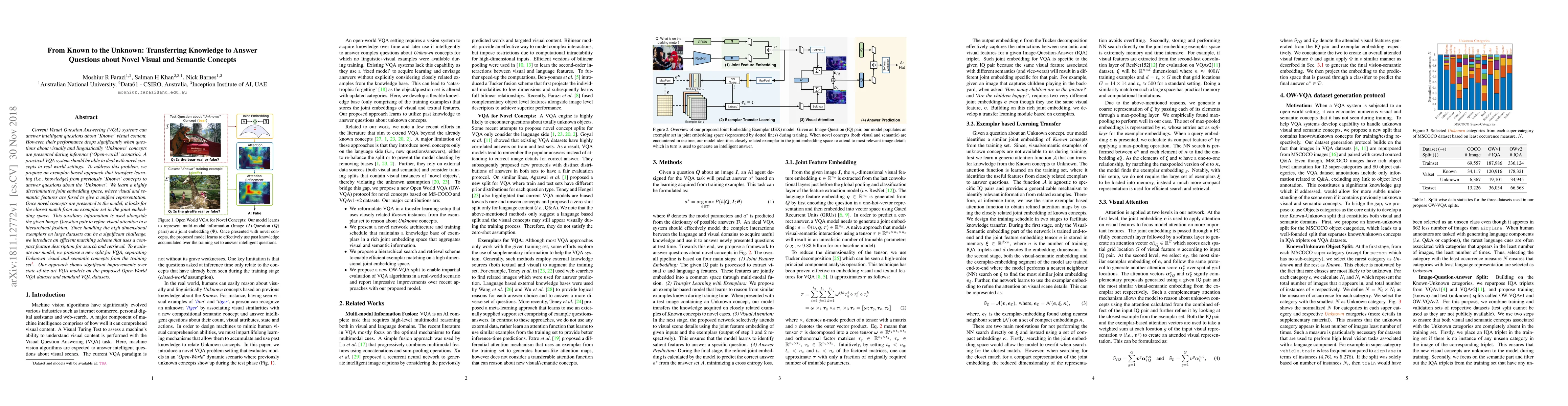 Current Visual Question Answering (VQA) systems can answer intelligent questions about `Known' visual content. However, their performance drops significantly when questions about visually and linguistically `Unknown' concepts are presented during inference (`Open-world' scenario). A practical VQA system should be able to deal with novel concepts in real world settings. To address this problem, we propose an exemplar-based approach that transfers learning (i.e., knowledge) from previously `Known' concepts to answer questions about the `Unknown'. We learn a highly discriminative joint embedding space, where visual and semantic features are fused to give a unified representation. Once novel concepts are presented to the model, it looks for the closest match from an exemplar set in the joint embedding space. This auxiliary information is used alongside the given Image-Question pair to refine visual attention in a hierarchical fashion. Since handling the high dimensional exemplars on large datasets can be a significant challenge, we introduce an efficient matching scheme that uses a compact feature description for search and retrieval. To evaluate our model, we propose a new split for VQA, separating Unknown visual and semantic concepts from the training set. Our approach shows significant improvements over state-of-the-art VQA models on the proposed Open-World VQA dataset and standard VQA datasets.