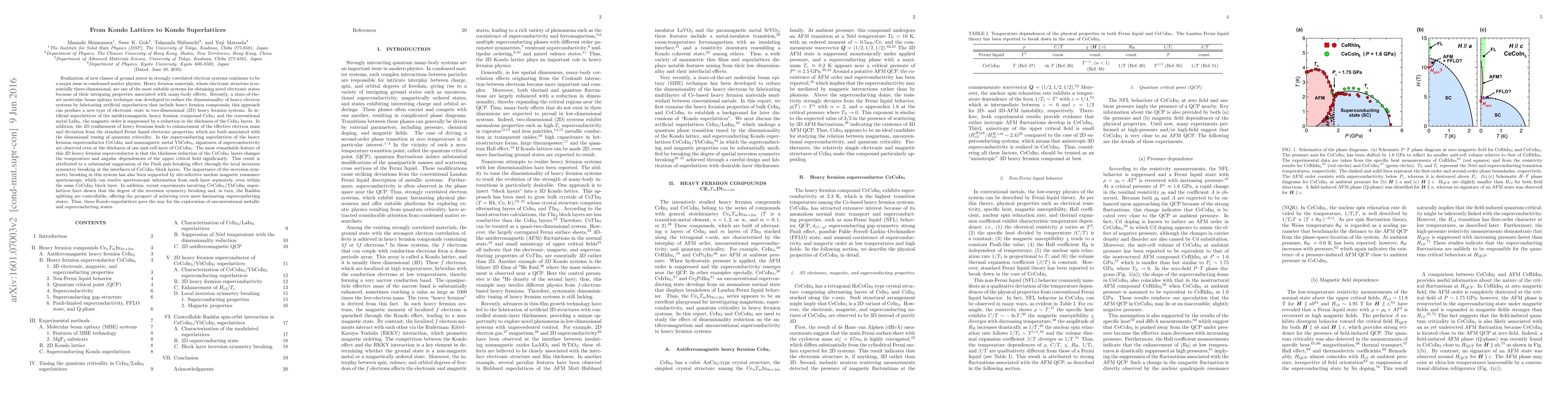 Realizing new classes of ground states in strongly correlated electron systems continues to be at the forefront of condensed matter physics. Heavy-fermion materials, whose electronic structure is essentially three-dimensional, are one of the most suitable systems for obtaining novel electronic states because they demonstrate many fascinating properties. Recently, a state-of-the-art MBE technique has been developed to reduce the dimensionality of the heavy electrons by fabricating heavy fermion superlattices, which can produce new electronic states present in two-dimensional (2D) heavy fermion system. In superlattices of antiferromagnetic heavy fermion CeIn3 and conventional metal LaIn3, the magnetic order is suppressed by reducing the thickness of the CeIn3 layers. The 2D confinement of heavy fermion also leads to the enhancement of the effective mass and the deviation from the Fermi liquid properties, which are associated with the dimensional tuning of quantum criticality. In superconducting superlattices of heavy fermion superconductor CeCoIn5 and nonmagnetic metal YbCoIn5, superconductivity is realized even at one-unit-cell-thick layer of CeCoIn5. The thickness reduction of the CeCoIn5 layers drastically changes the temperature and angular dependencies of the upper critical field. This result would be attributed to a suppression of the Pauli pair-breaking effect through the local inversion symmetry breaking (ISB) at the interfaces of CeCoIn5 block layers. The importance of the ISB in this system has also been supported by site-selective nuclear magnetic resonance spectroscopy. In addition, recent experiment of CeCoIn5/YbCoIn5 superlattices have shown that the degree of the ISB are controllable, which offers the prospect of achieving even more fascinating superconducting states. These Kondo superlattices, thus, pave the way for exploring unusual metallic and superconducting states.