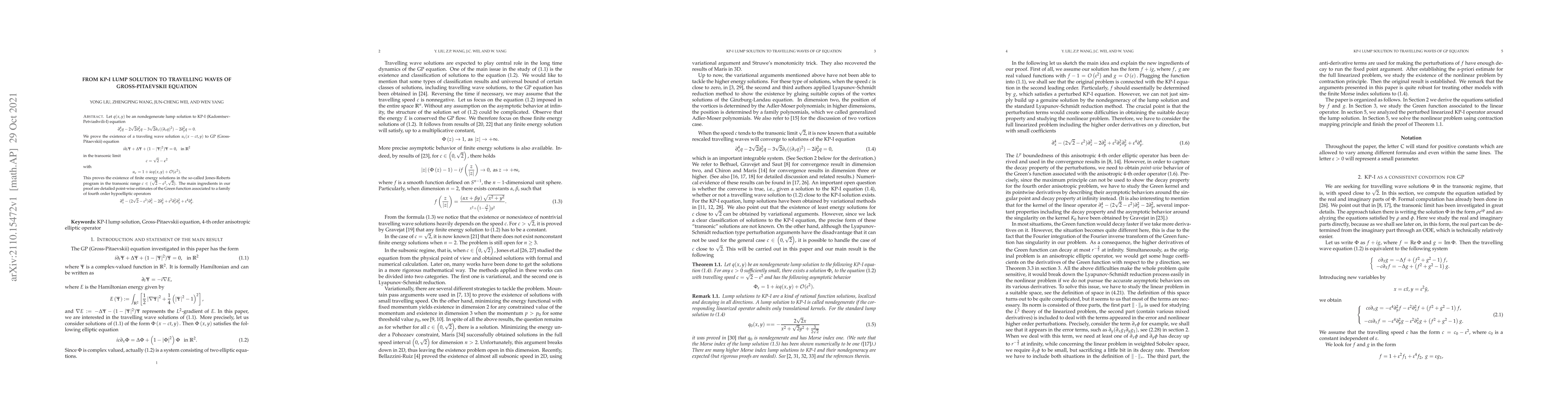 This paper establishes the existence of traveling wave solutions to the Gross-Pitaevskii equation from a nondegenerate lump solution of the KP-I equation in the transonic limit, providing finite energy solutions as part of the Jones-Roberts program. Key techniques involve detailed point-wise estimates of the Green function for a family of fourth-order hypoelliptic operators.