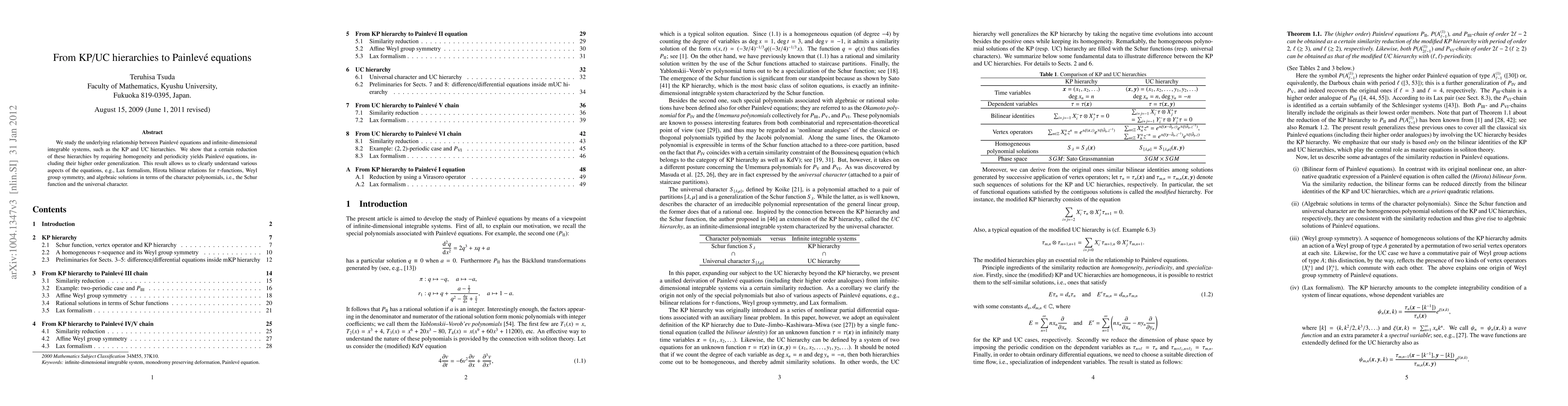 This paper explores the connection between Painlevé equations and infinite-dimensional integrable systems like the KP and UC hierarchies, demonstrating that reductions based on homogeneity and periodicity yield Painlevé equations, thereby elucidating their Lax formalism, Hirota bilinear relations, Weyl group symmetry, and algebraic solutions.