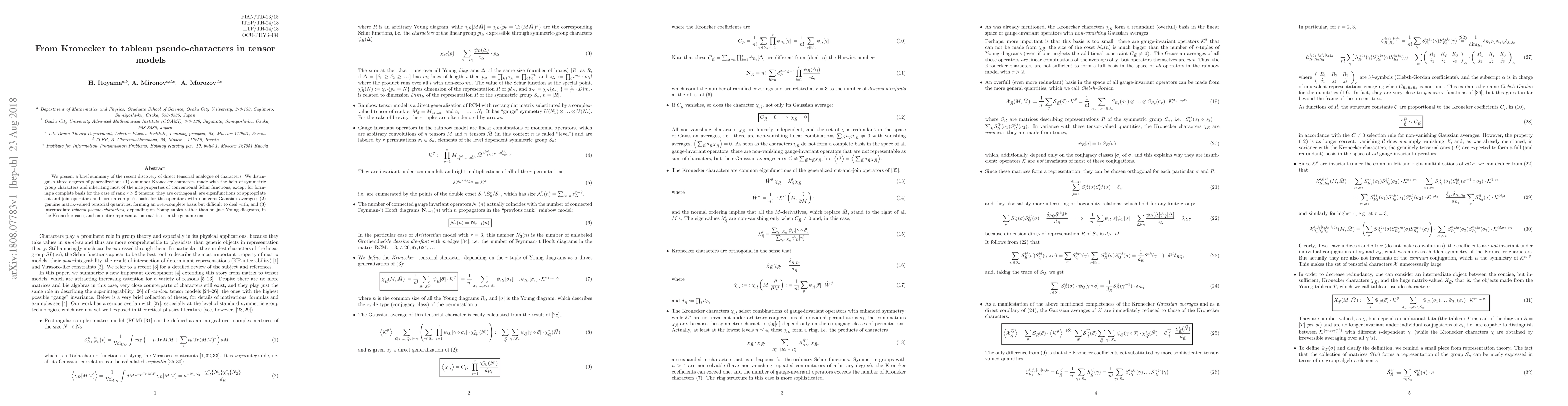 We present a brief summary of the recent discovery of direct tensorial analogue of characters. We distinguish three degrees of generalization: (1) $c$-number Kronecker characters made with the help of symmetric group characters and inheriting most of the nice properties of conventional Schur functions, except for forming a complete basis for the case of rank $r>2$ tensors: they are orthogonal, are eigenfunctions of appropriate cut-and-join operators and form a complete basis for the operators with non-zero Gaussian averages; (2) genuine matrix-valued tensorial quantities, forming an over-complete basis but difficult to deal with; and (3) intermediate tableau pseudo-characters, depending on Young tables rather than on just Young diagrams, in the Kronecker case, and on entire representation matrices, in the genuine one.