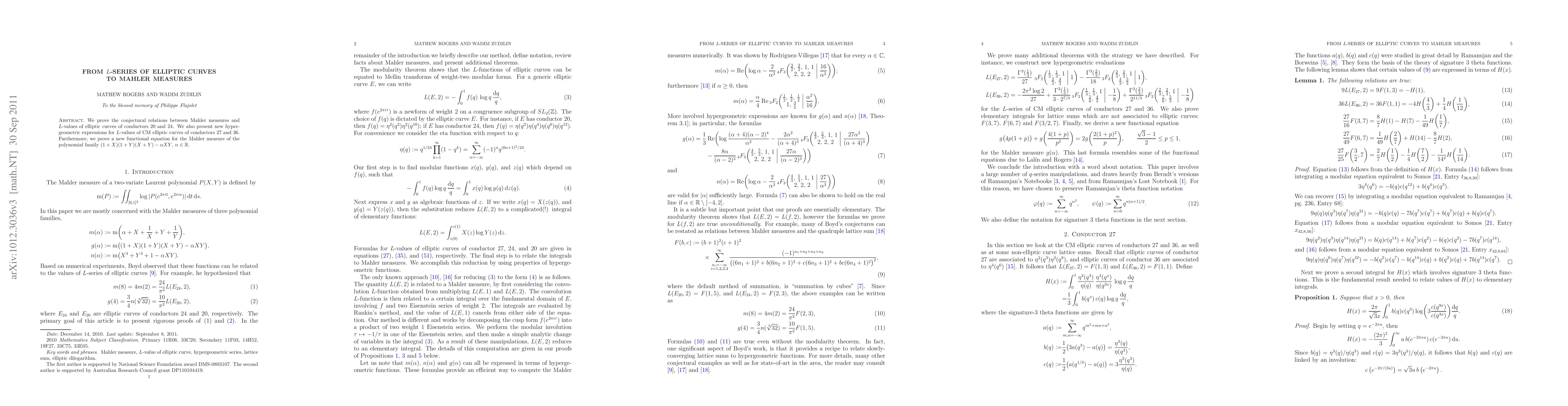This paper establishes conjectural connections between Mahler measures and $L$-values for elliptic curves of specific conductors, provides new hypergeometric expressions for CM elliptic curves, and proves a novel functional equation for a Mahler measure polynomial family.